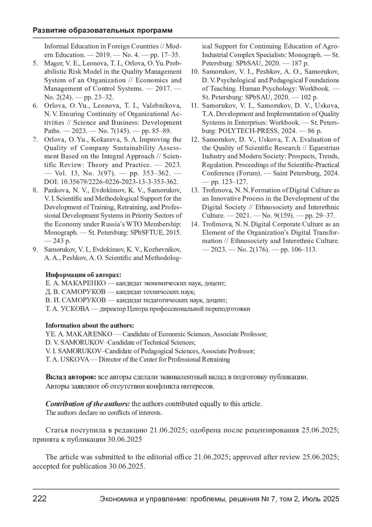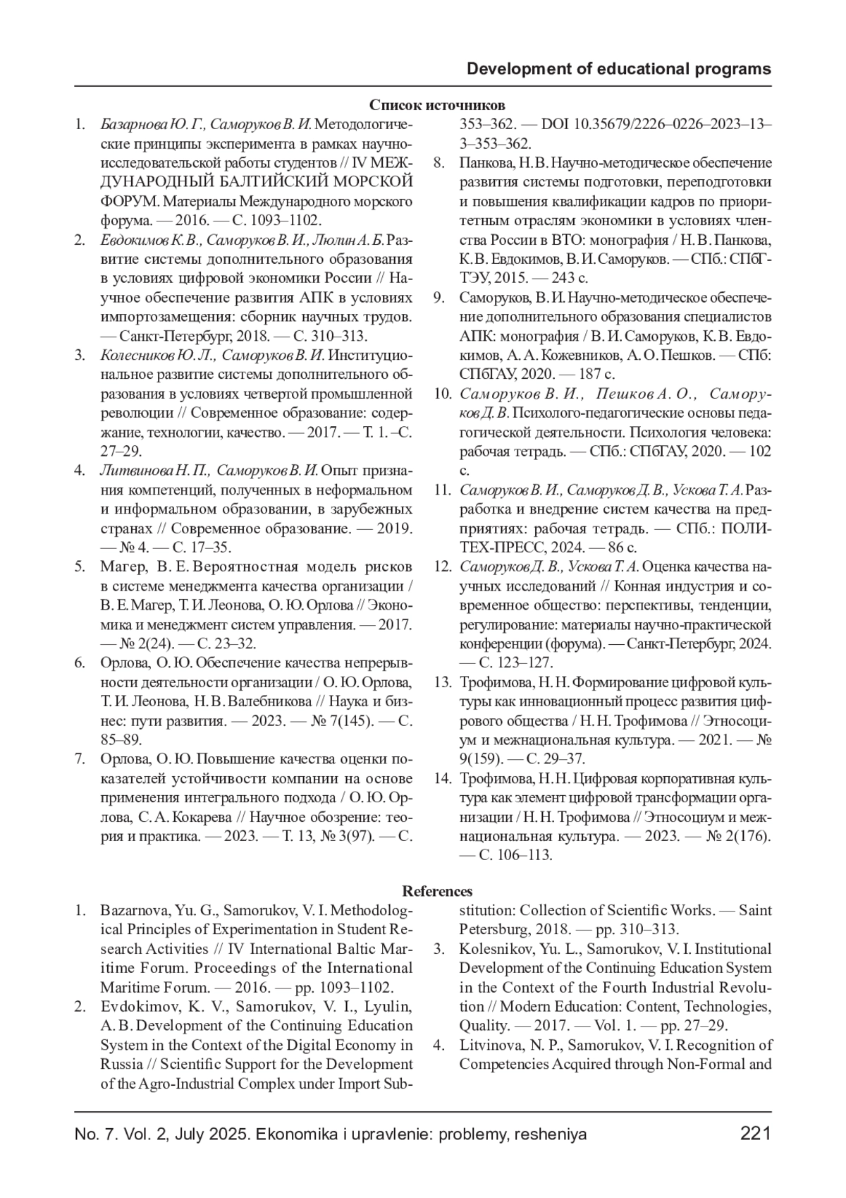 9. Саморуков, В. И. Научно- методическое обеспечение дополнительного образования специалистов АПК: монография / В. И. Саморуков, К. В. Евдокимов, А. А. Кожевников, А. О. Пешков. - СПб: СПбГАУ, 2020. - 187 с. EDN: YMANIX