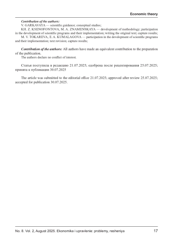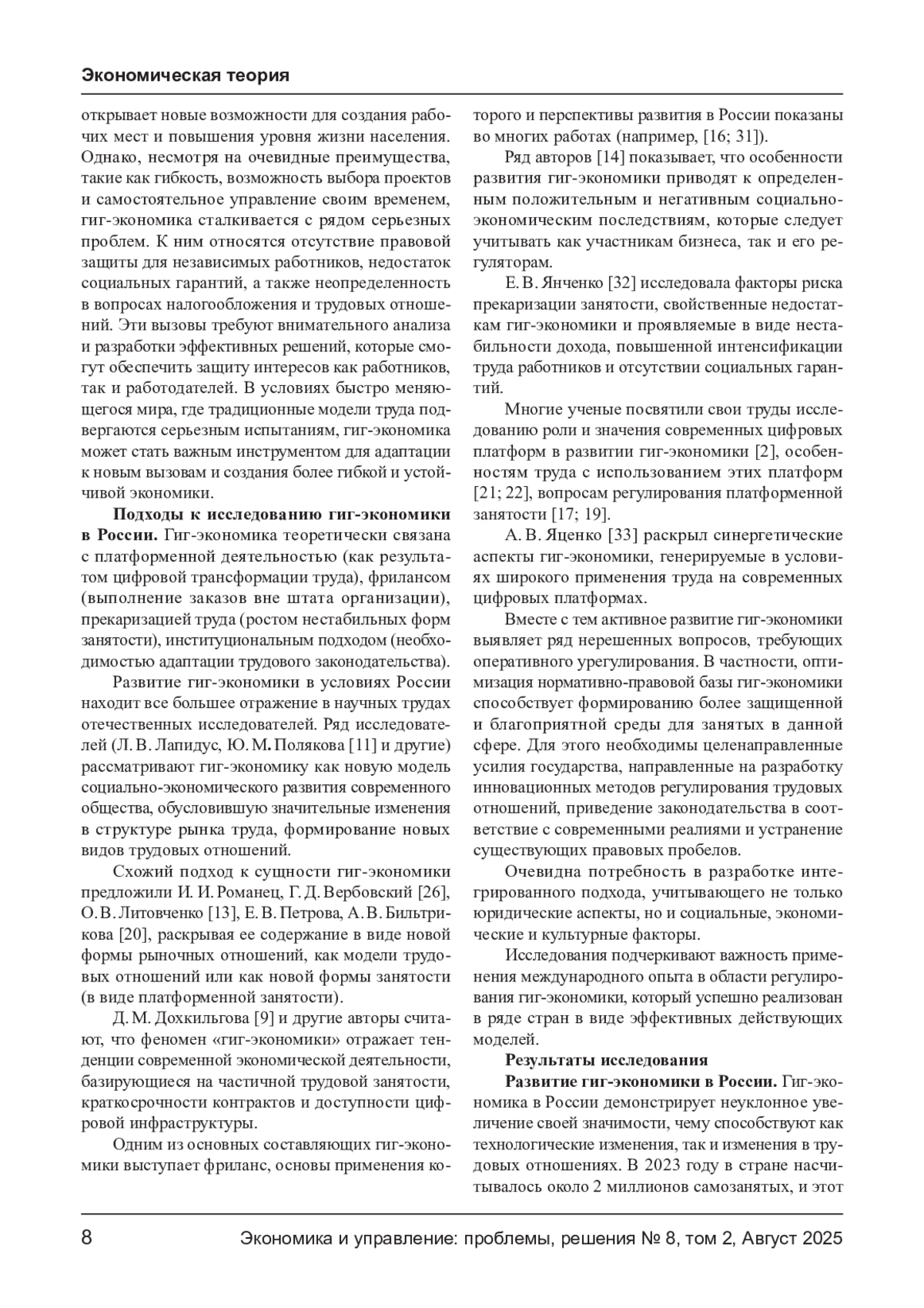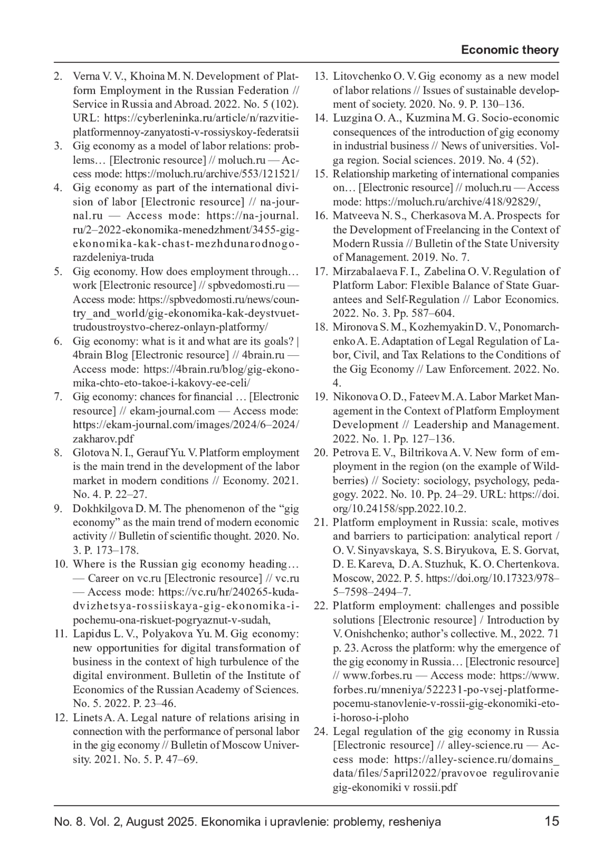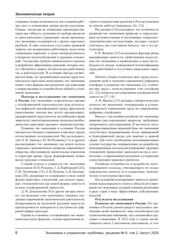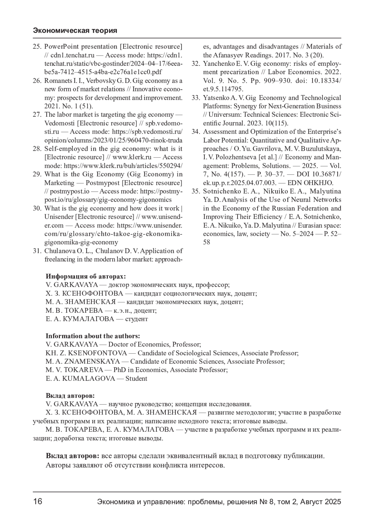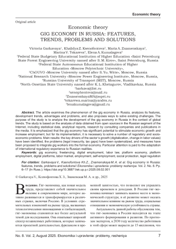 ГАРЬКАВАЯ В. Ф., КСЕНОФОНТОВА Х. З., ЗНАМЕНСКАЯ М. А., ТОКАРЕВА М. В., КУМАЛАГОВА Е. А. ГИГ-ЭКОНОМИКА В РОССИИ: ОСОБЕННОСТИ, ТЕНДЕНЦИИ, ПРОБЛЕМЫ И ПУТИ РЕШЕНИЯ // ЭКОНОМИКА И УПРАВЛЕНИЕ: ПРОБЛЕМЫ, РЕШЕНИЯ. 2025. ТОМ 2 № 8