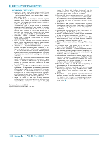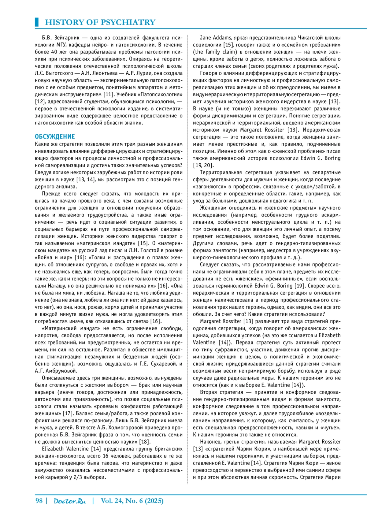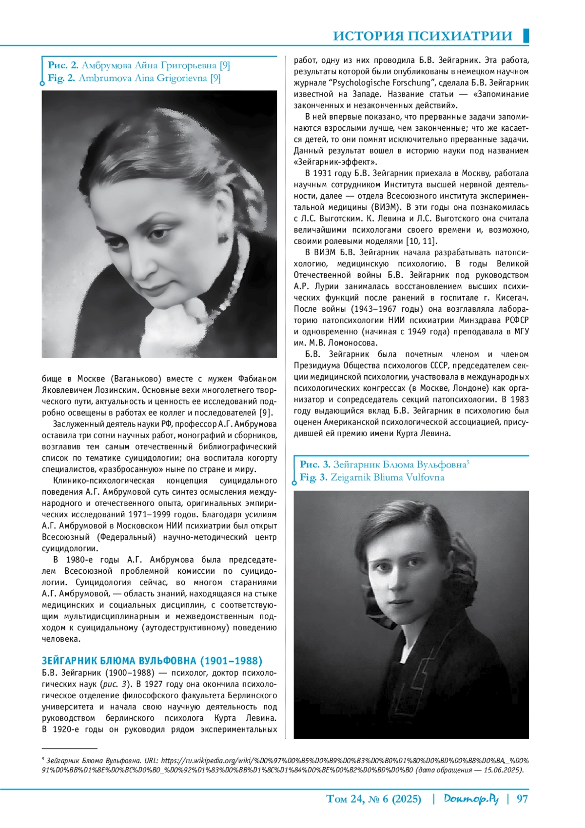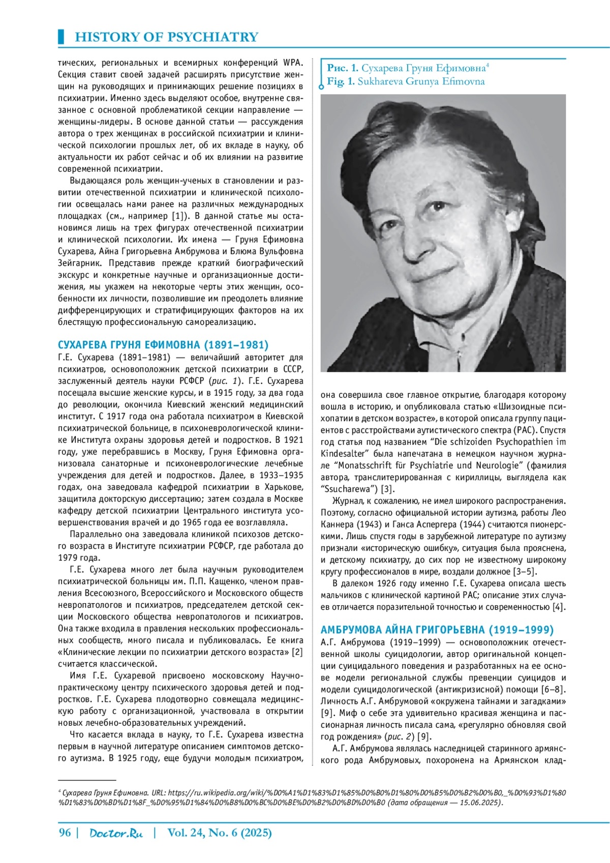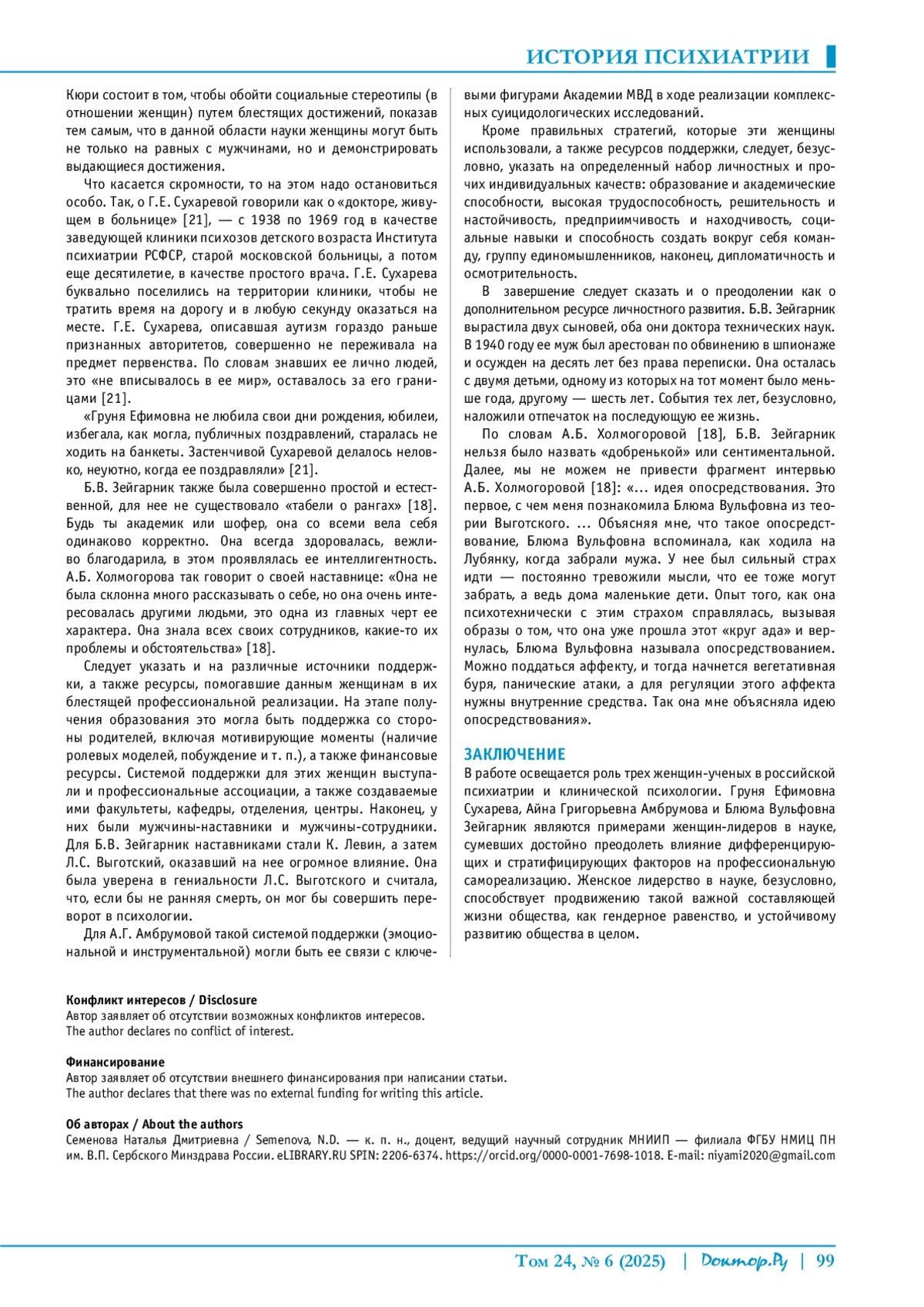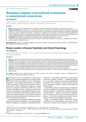 СЕМЕНОВА Н. Д. ЖЕНЩИНЫ-ЛИДЕРЫ В РОССИЙСКОЙ ПСИХИАТРИИ И КЛИНИЧЕСКОЙ ПСИХОЛОГИИ // ДОКТОР. РУ. 2025. № 6, ТОМ 24