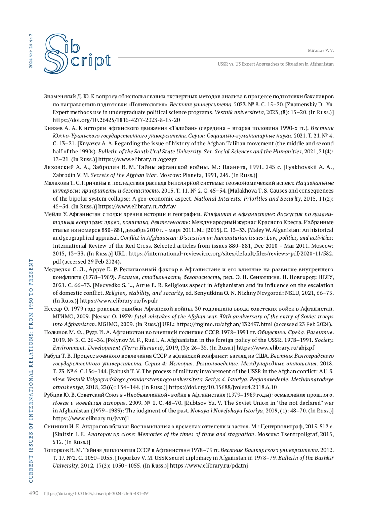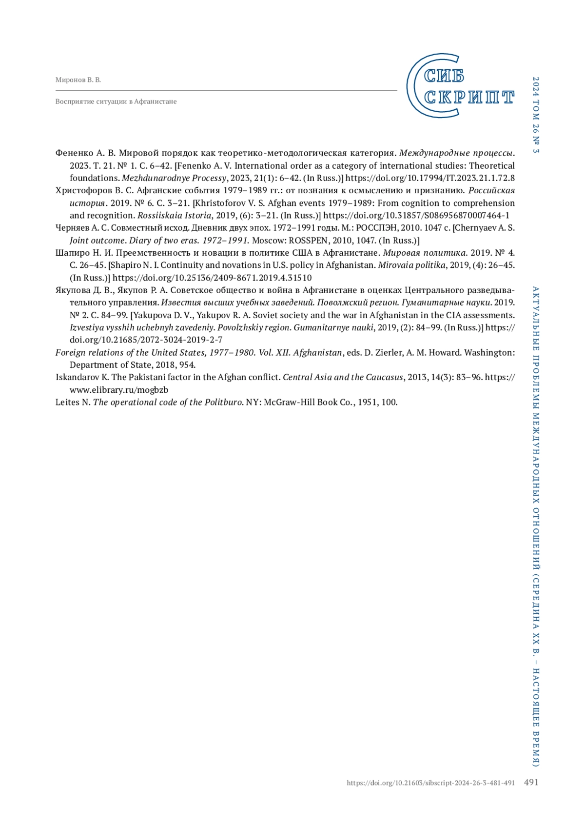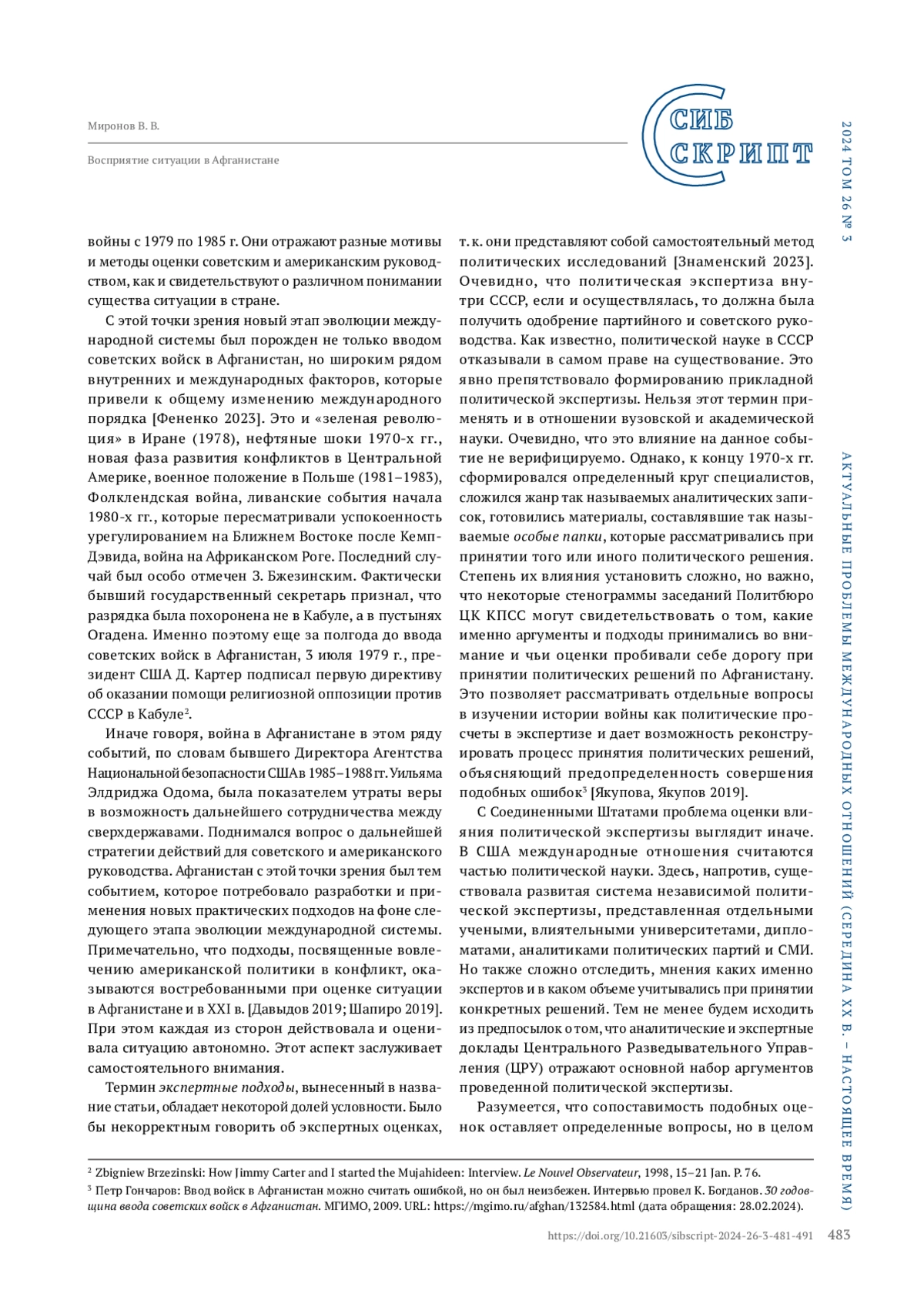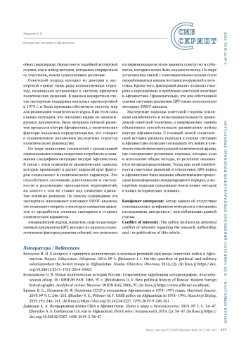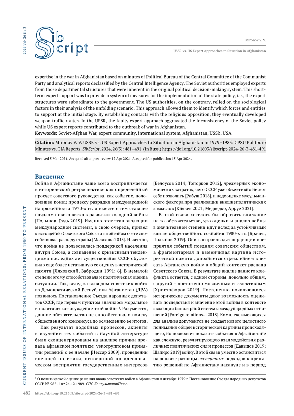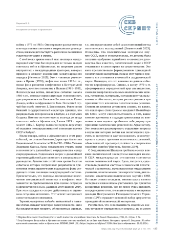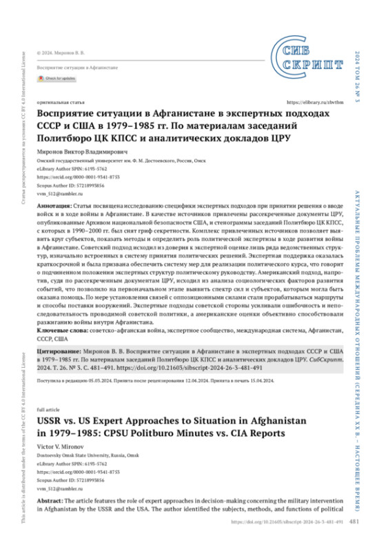 МИРОНОВ В. В. ВОСПРИЯТИЕ СИТУАЦИИ В АФГАНИСТАНЕ В ЭКСПЕРТНЫХ ПОДХОДАХ СССР И США В 1979–1985 ГГ. ПО МАТЕРИАЛАМ ЗАСЕДАНИЙ ПОЛИТБЮРО ЦК КПСС И АНАЛИТИЧЕСКИХ ДОКЛАДОВ ЦРУ // СИБСКРИПТ. 2025. ТОМ 27, №3