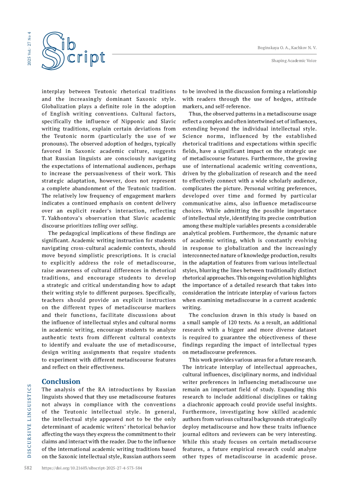 Задача выявления и описания культурно детерминированных особенностей академического дискурса является актуальной в современном дискурс-анализе, стилистике научного текста и прикладной лингвистике. Цель статьи – изучить влияние тевтонического интеллектуального стиля на метадискурсивную организацию введений научных статей, написанных российскими авторами. 120 статей в области теоретической и прикладной лингвистики были исследованы с опорой на теорию интеллектуальных стилей Дж. Гальтунга. Для достижения поставленной цели в ходе исследования были использованы методы количественного и интерпретативного анализа. Было выявлено, что в русскоязычных научных текстах преобладают бустеры. Кроме того, регулярно встречаются хеджи и маркеры оценки. С целью самореференции авторами использовались только местоимения первого лица множественного числа как в статьях с одним, так и с несколькими авторами. При этом маркеры самореференции оказались самой малочисленной группой метадискурсивных средств. Как показало исследование, тевтонский интеллектуальный стиль, который, согласно теории Дж. Гальтунга, доминирует в российской академической культуре, не является единственной детерминантой риторического поведения авторов. Международные конвенции академического письма, основывающиеся на саксонском интеллектуальном стиле, также оказывают влияние. Гипотеза о доминирующем влиянии тевтонского интеллектуального стиля на современный русскоязычный научный дискурс не объясняет в полной мере особенностей русскоязычного академического письма. В качестве перспективы исследования можно указать на необходимость изучения данного аспекта научного текста на материале статей, написанных представителями естественно-научных дисциплин. Диахронические вариации в использовании метадискурсивных паттернов в жанре научной статьи также могут представлять интерес для исследователей.