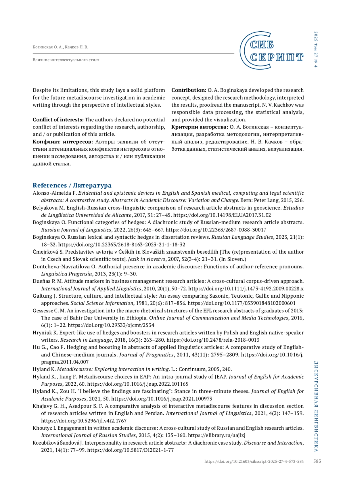 3. Boginskaya O. Functional categories of hedges: A diachronic study of Russian-medium research article abstracts. Russian Journal of Linguistics, 2022, 26(3): 645-667. https://doi.org/10.22363/2687-0088-30017