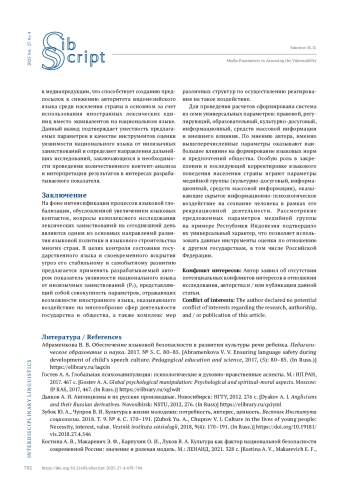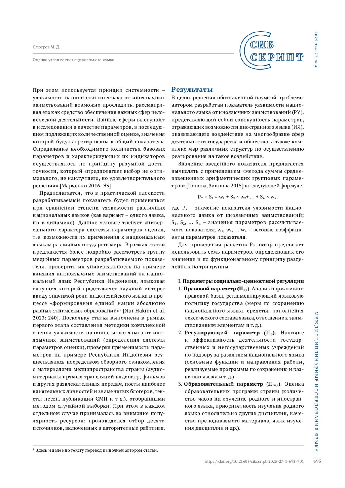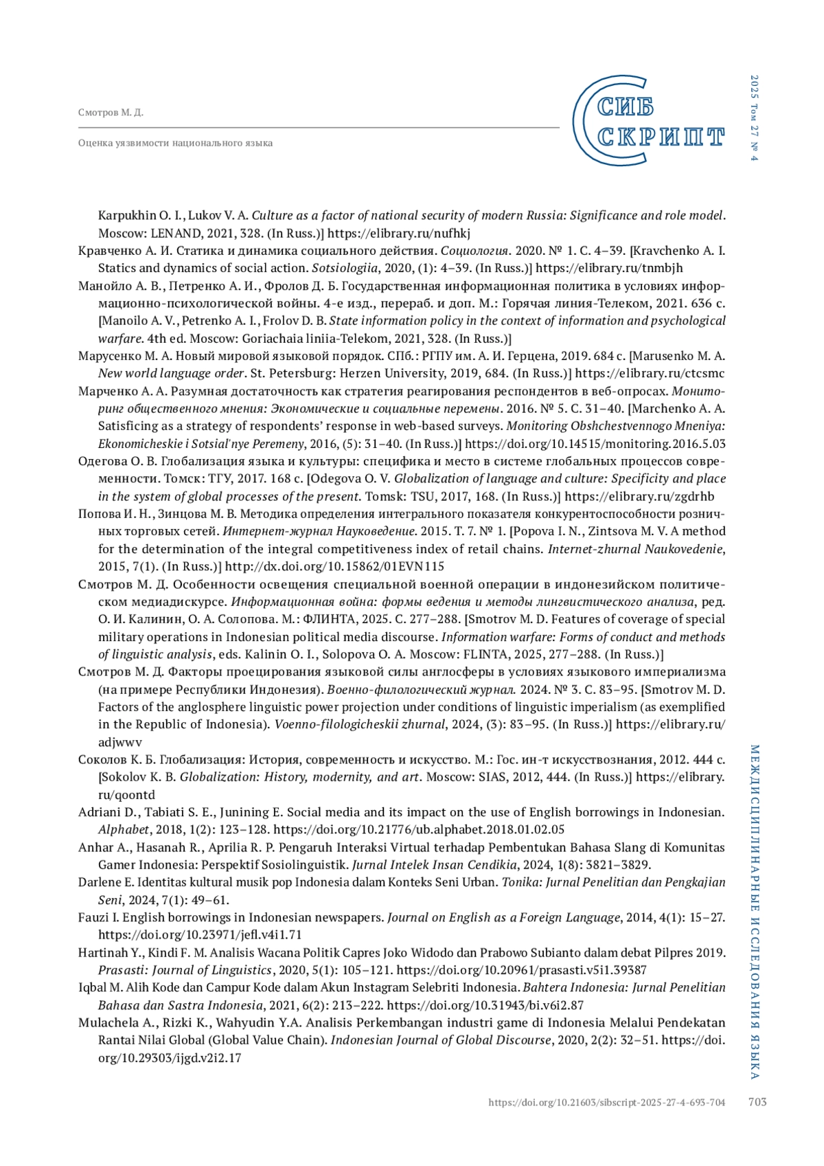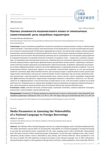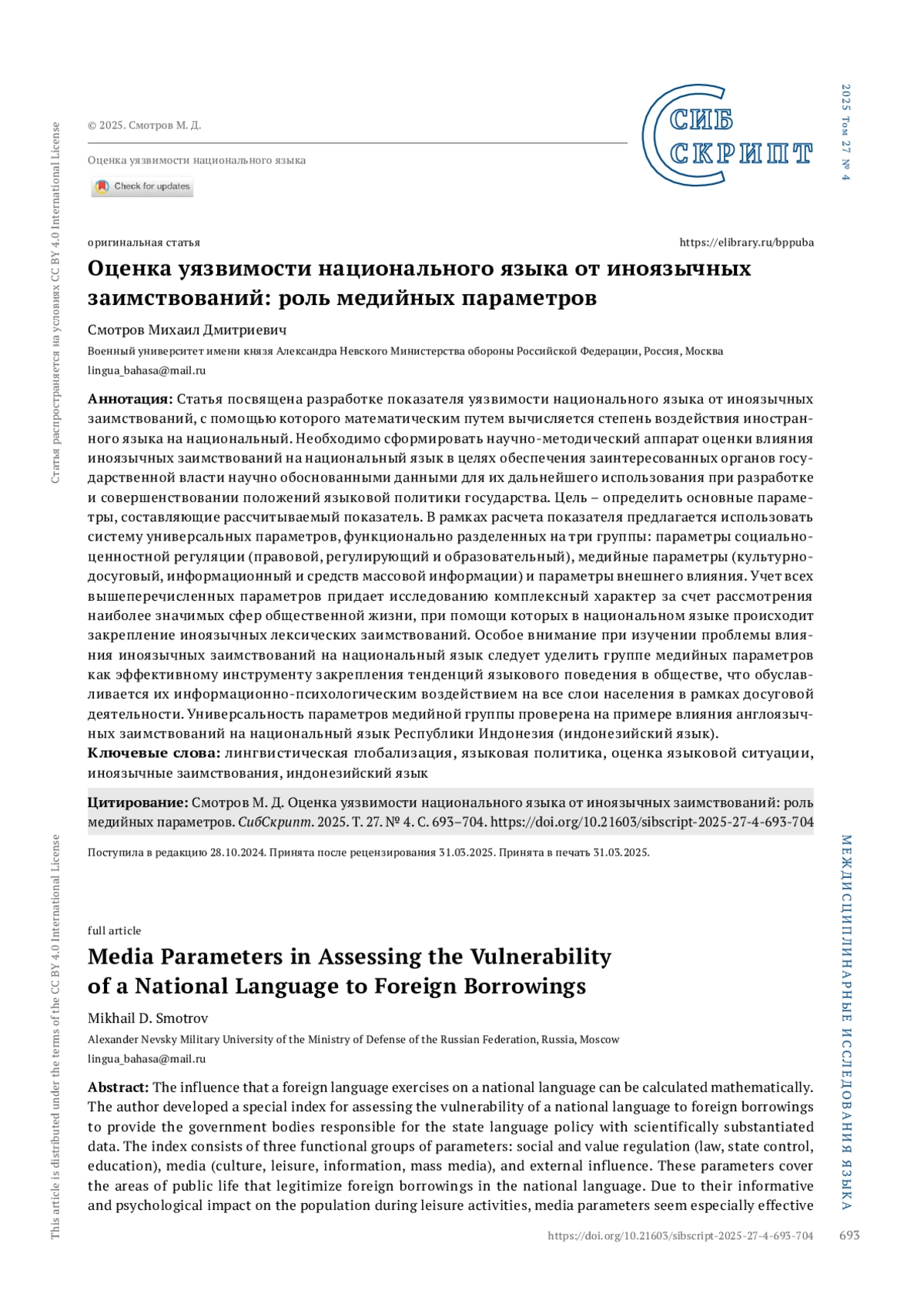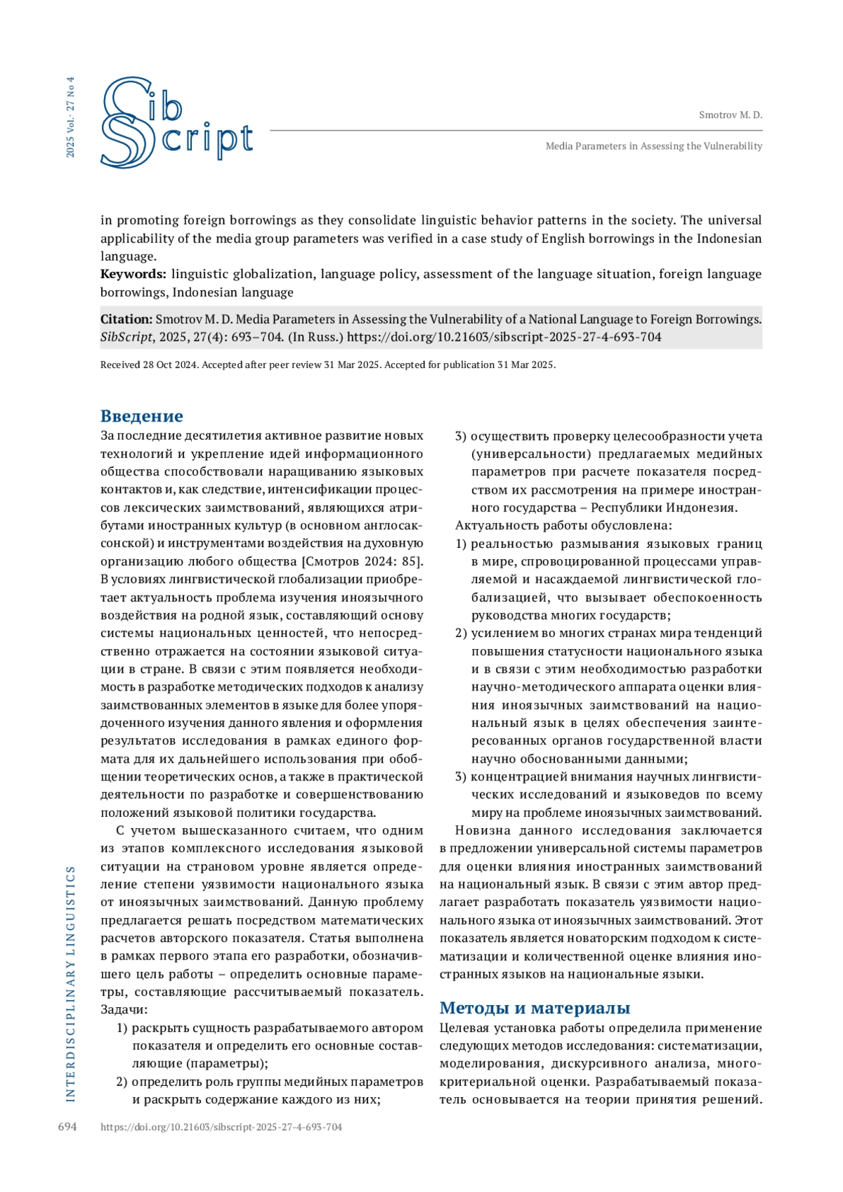 СМОТРОВ М. Д. ОЦЕНКА УЯЗВИМОСТИ НАЦИОНАЛЬНОГО ЯЗЫКА ОТ ИНОЯЗЫЧНЫХ ЗАИМСТВОВАНИЙ: РОЛЬ МЕДИЙНЫХ ПАРАМЕТРОВ // СИБСКРИПТ. 2025. Т. 27, № 4