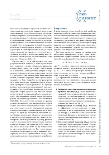 Статья посвящена разработке показателя уязвимости национального языка от иноязычных заимствований, с помощью которого математическим путем вычисляется степень воздействия иностранного языка на национальный. Необходимо сформировать научно-методический аппарат оценки влияния иноязычных заимствований на национальный язык в целях обеспечения заинтересованных органов госу дарственной власти научно обоснованными данными для их дальнейшего использования при разработке и совершенствовании положений языковой политики государства. Цель – определить основные параметры, составляющие рассчитываемый показатель. В рамках расчета показателя предлагается использовать систему универсальных параметров, функционально разделенных на три группы: параметры социально- ценностной регуляции (правовой, регулирующий и образовательный), медийные параметры (культурно- досуговый, информационный и средств массовой информации) и параметры внешнего влияния. Учет всех вышеперечисленных параметров придает исследованию комплексный характер за счет рассмотрения наиболее значимых сфер общественной жизни, при помощи которых в национальном языке происходит закрепление иноязычных лексических заимствований. Особое внимание при изучении проблемы влияния иноязычных заимствований на национальный язык следует уделить группе медийных параметров как эффективному инструменту закрепления тенденций языкового поведения в обществе, что обуславливается их информационно-психологическим воздействием на все слои населения в рамках досуговой деятельности. Универсальность параметров медийной группы проверена на примере влияния англоязычных заимствований на национальный язык Республики Индонезия (индонезийский язык).