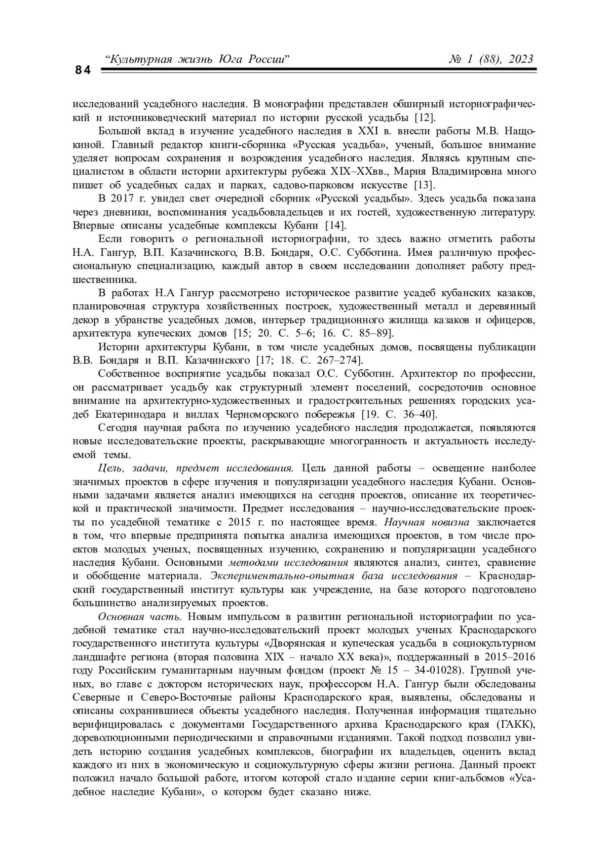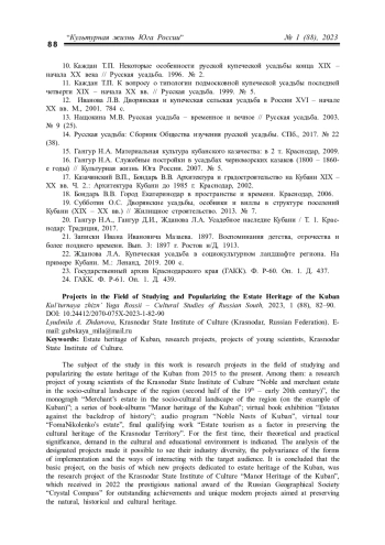 Статья: ПРОЕКТЫ В СФЕРЕ ИЗУЧЕНИЯ И ПОПУЛЯРИЗАЦИИ УСАДЕБНОГО НАСЛЕДИЯ КУБАНИ (2023)