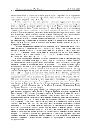Статья посвящена рассмотрению проблемы коммеморации в монументальном искусстве Китая и России в аспекте актуальной сегодня военно-патриотической темы. Предмет исследования – монументальное искусство России и Китая периода середины ХХ века с конца 1940-х – 1950-е годы. Новизна исследования заключается в том, что в публикации освещаются такие важные для современного монументального искусства понятия, как «коммеморация» и «места памяти». Материалом статьи стало монументальное искусство России и Китая как пример воплощения реализации монументальных коммеморативных практик. Методология представленного исследования основывается на совокупности научных подходов, необходимых для раскрытия проблематики статьи. За основу взят комплексный подход, включающий принцип сравнительного анализа. В качестве основного вывода в статье подчеркивается, что одной из главных современных коммеморативных практик, имеющих ключевое значение для патриотического воспитания и сохранения памяти об историческом прошлом, является создание мемориалов и памятников