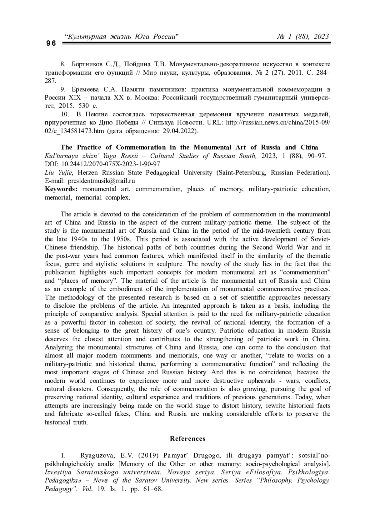 1. Рягузова Е.В. Память Другого, или другая память: социально-психологический анализ // Известия Саратовского университета. Новая серия. Серия “Философия. Психология. Педагогика”. Т. 19. Вып. 1. Саратов, 2019. С. 61-68. EDN: PWIMPM