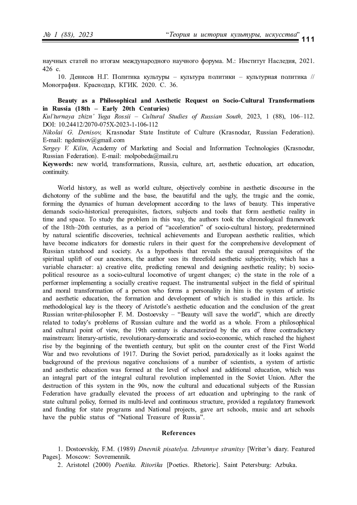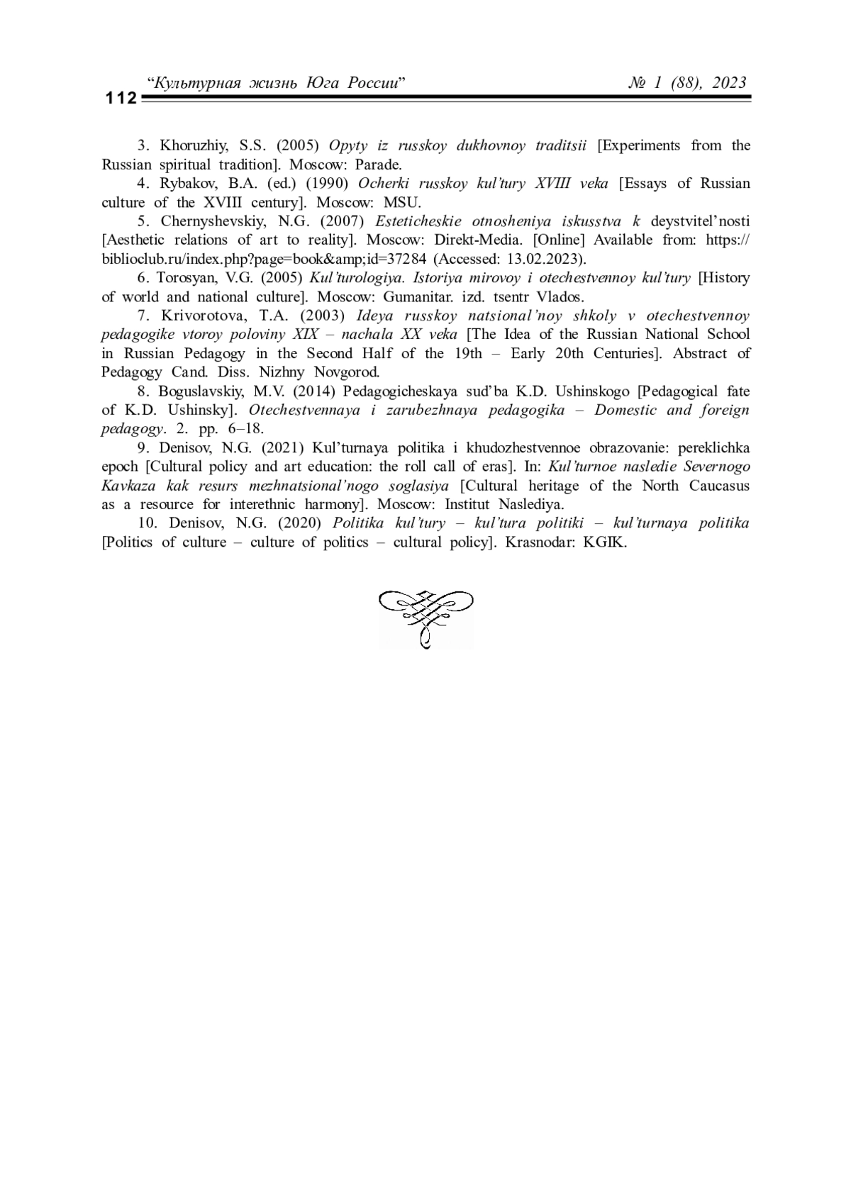 9. Денисов Н.Г. Культурная политика и художественное образование: перекличка эпох // Культурное наследие Северного Кавказа как ресурс межнационального согласия: сборник научных статей по итогам международного научного форума. М.: Институт Наследия, 2021. 426 с.