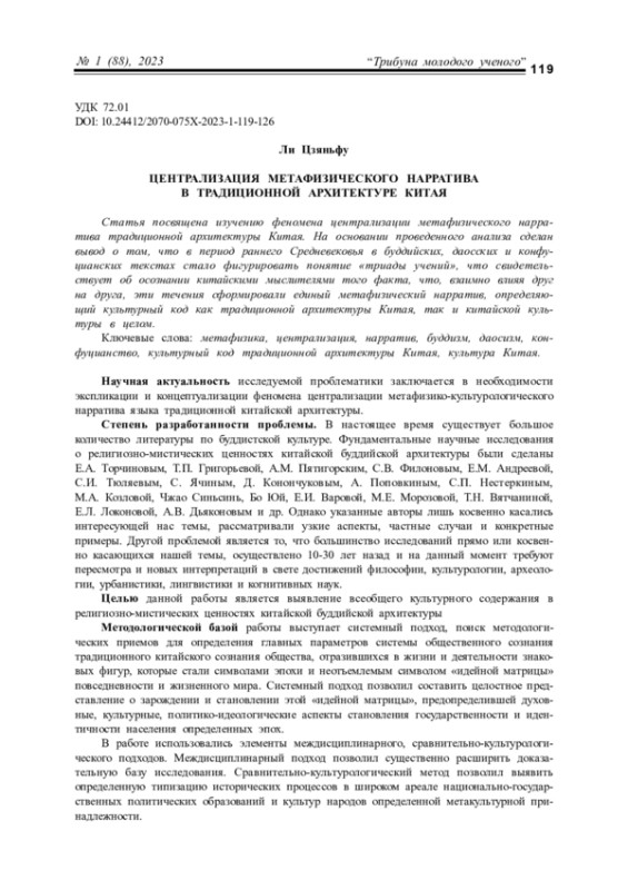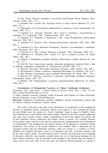 Статья посвящена изучению феномена централизации метафизического нарратива традиционной архитектуры Китая. На основании проведенного анализа сделан вывод о том, что в период раннего Средневековья в буддийских, даосских и конфуцианских текстах стало фигурировать понятие «триады учений», что свидетельствует об осознании китайскими мыслителями того факта, что, взаимно влияя друг на друга, эти течения сформировали единый метафизический нарратив, определяющий культурный код как традиционной архитектуры Китая, так и китайской культуры в целом.