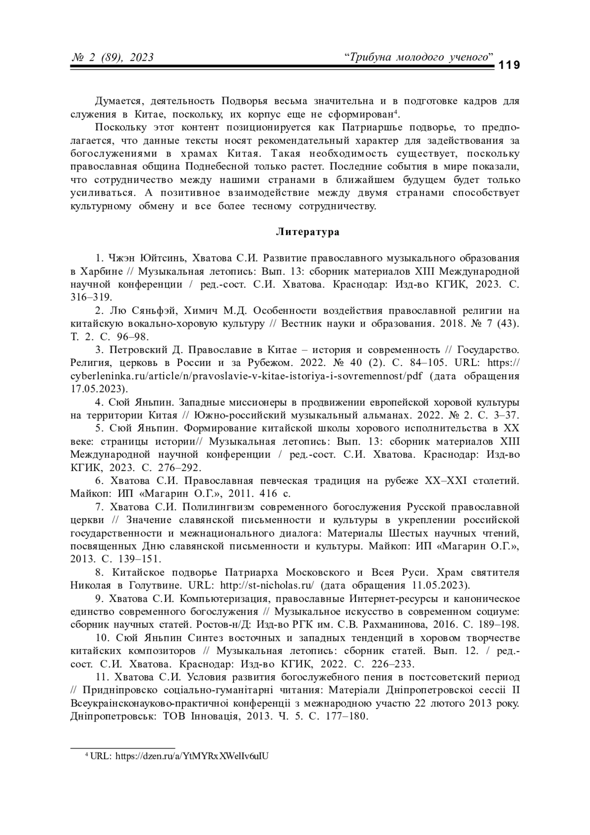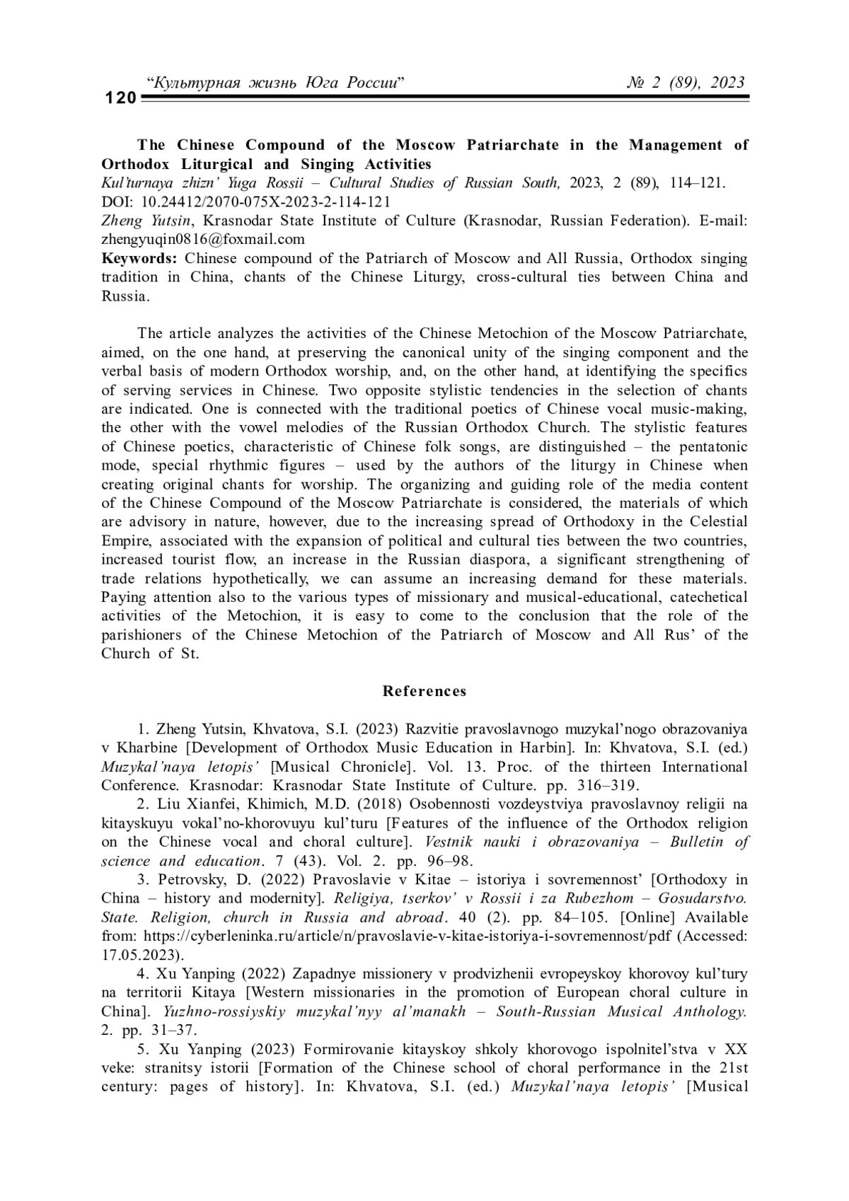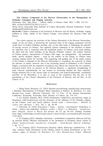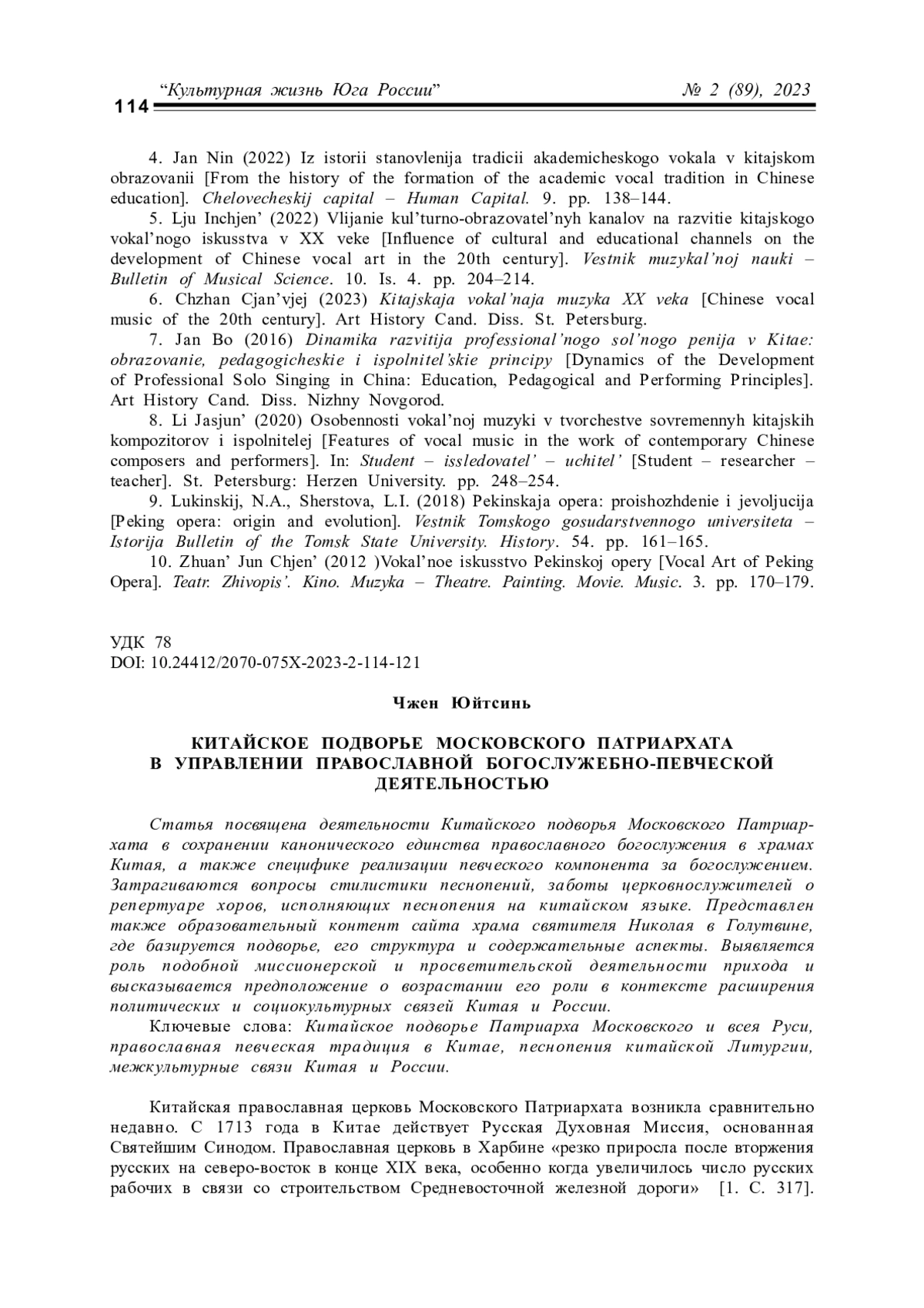ЧЖЕН Ю. КИТАЙСКОЕ ПОДВОРЬЕ МОСКОВСКОГО ПАТРИАРХАТА В УПРАВЛЕНИИ ПРАВОСЛАВНОЙ БОГОСЛУЖЕБНО-ПЕВЧЕСКОЙ ДЕЯТЕЛЬНОСТЬЮ // КУЛЬТУРНАЯ ЖИЗНЬ ЮГА РОССИИ. 2023. № 2 (89)