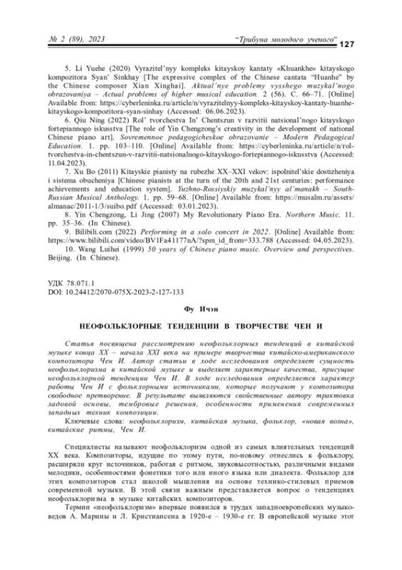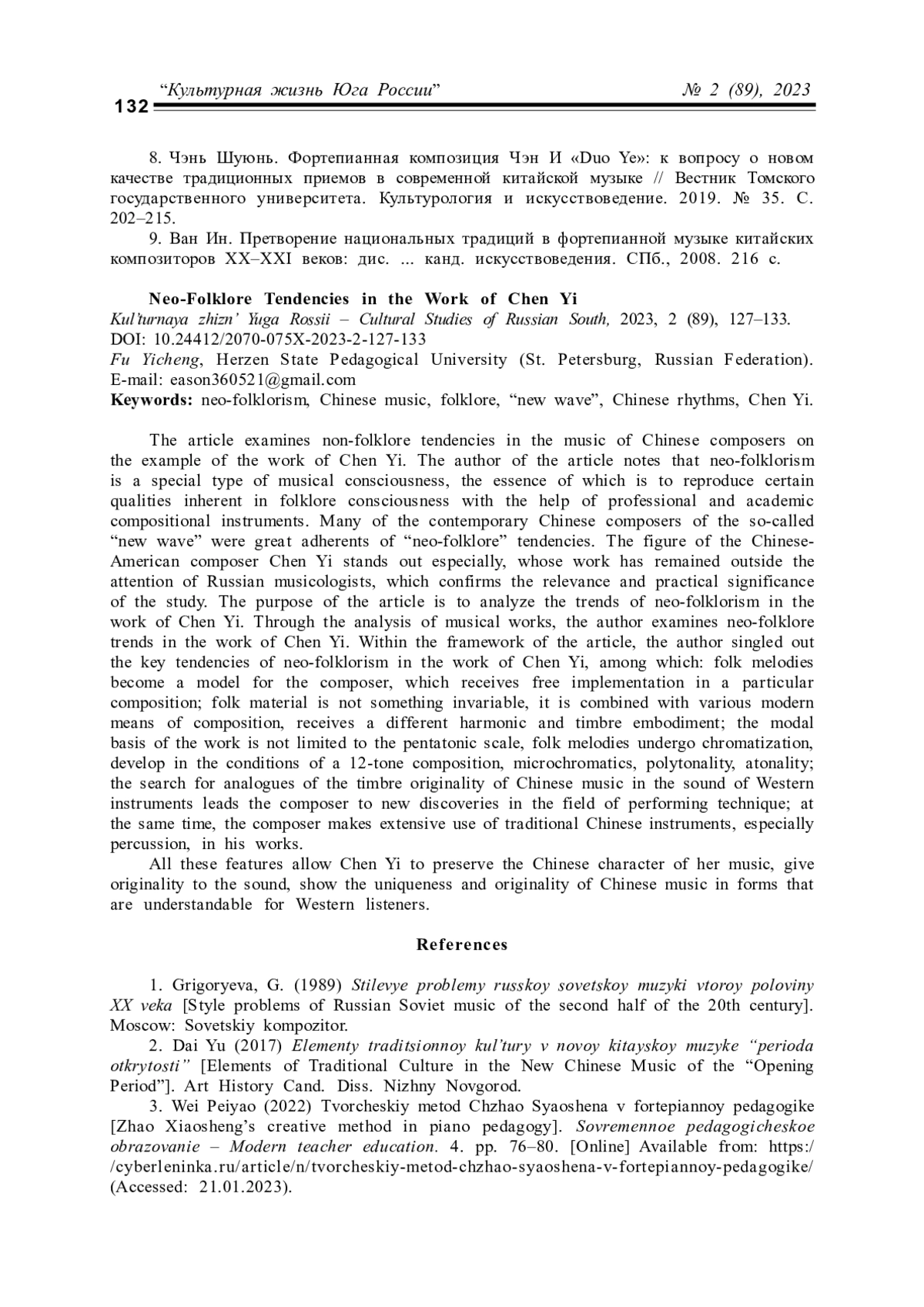 ФУ И. НЕОФОЛЬКЛОРНЫЕ ТЕНДЕНЦИИ В ТВОРЧЕСТВЕ ЧЕН И // КУЛЬТУРНАЯ ЖИЗНЬ ЮГА РОССИИ. 2023. № 2 (89)