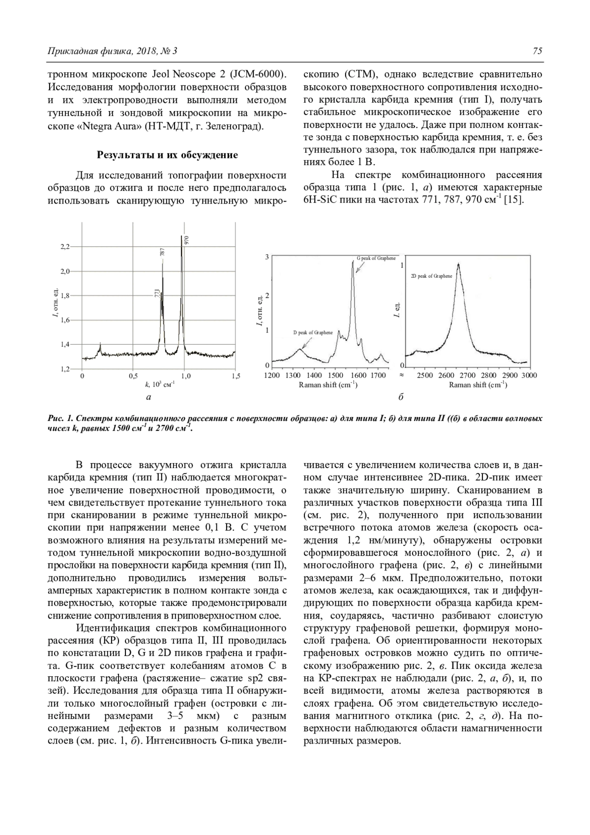 В работе проведено исследование влияния потоков атомов железа на формирование слоев графена на поверхности монокристаллов карбида кремния в процессе его вакуумной термодеструкции. Установлено, что при небольшой интенсивности потока железа (1 нм/мин.) формируются моно- или бислои графена, в которых железо частично растворяется, причем без образования нанокристаллов, кластеров и т. п. При более интенсивных потоках железа (6 нм/мин.) слои графена не образуются: поверхность кристаллов карбида кремния оказывается покрытой металлической пленкой железа. В отсутствие потоков железа в процессе термодеструкции на поверхности карбида кремния обнаружен только многослойный графен (островки с линейными размерами 3–5 мкм) с разным содержанием дефектов и разным количеством слоев.