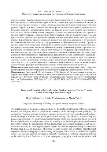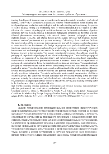 Рассматриваются педагогические условия профессиональной подготовки учителя иностранного языка, в основе проектирования которых лежат научные представления о смысловой парадигме. Обозначение «смысловая парадигма» указывает на приоритетность формирования профессионально-личностных смыслов у студентов в процессе профессиональной подготовки. Актуальность проблемы исследования педагогических условий модернизации профессиональной подготовки учителя в русле смысловой парадигмы диктуется сменой акцента в целевых приоритетах профессиональной подготовки. Выполнение учителем сложных профессиональных задач своей деятельности невозможно вне актуализации его профессионально-личностных смыслов, что определяет задачу педагогического обеспечения их становления уже на этапе подготовки в вузе. Цель статьи: на основе анализа научной литературы и обобщения опыта профессиональной деятельности в сфере подготовки учителя иностранного языка уточить значение смысловой парадигмы как эвристической основы для обновления образовательной практики в вузе и предложить педагогические условия профессиональной подготовки, отвечающие ее сущности и учитывающие современные требования к профессиональной личности учителя. Новизна исследования связана с концептуализацией смысловой парадигмы как продуктивного методологического инструмента познания и преобразования процесса профессиональной подготовки учителя, как детерминирующей основы его модернизации; а также видится в определении комплекса педагогических условий, побуждающих действие внутренних механизмов профессионально-личностного смыслообразования. Педагогические условия раскрываются в статье как многозначное явление, объединяющее внешние (содержание, педагогические меры, методы, средства и т. п.) и внутренние (психологические, личностные) факторы, определяющие формирование у студентов профессионально-личностных смыслов. В совокупности они определяют преобразование процесса профессиональной подготовки в русле смысловой парадигмы для обеспечения эффективного становления профессиональной личности учителя иностранного языка. С точки зрения функционального назначения педагогические условия определяются как сложный, системно организованный инструментально-методологический механизм модернизации профессиональной подготовки учителя иностранного языка в вузе. Эта система включает три группы условий: научно-педагогические, организационно-педагогические, образовательно-педагогические. Научно-педагогические условия представлены трансдисциплинарным и иформационно-смысловым подходами, предполагающими формирование профессиональных концептов в сознании студентов и организацию педагогического общения в процессе формирования профессиональных знаний. Организационно-педагогические условия обеспечивают деятельностно-практический характер овладения профессиональными навыками. Образовательно-педагогические условия предполагают реализацию герменевтических методов обучения для формирования профессионально-личностных смыслов при овладении профессионально значимой информацией. В статье приведены наиболее существенные характеристики всех групп условий. Выполненное исследование позволяет сделать заключение, что профессиональная подготовка
