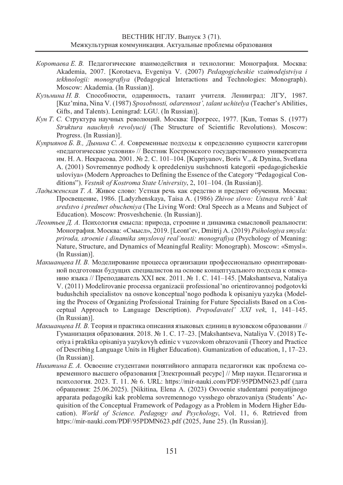 26. Никитина Е. А. Освоение студентами понятийного аппарата педагогики как проблема современного высшего образования [Электронный ресурс] // Мир науки. Педагогика и психология. 2023. Т. 11. № 6. URL: https://mir-nauki.com/PDF/95PDMN623.pdf (дата обращения: 25.06.2025). EDN: LEMRHR