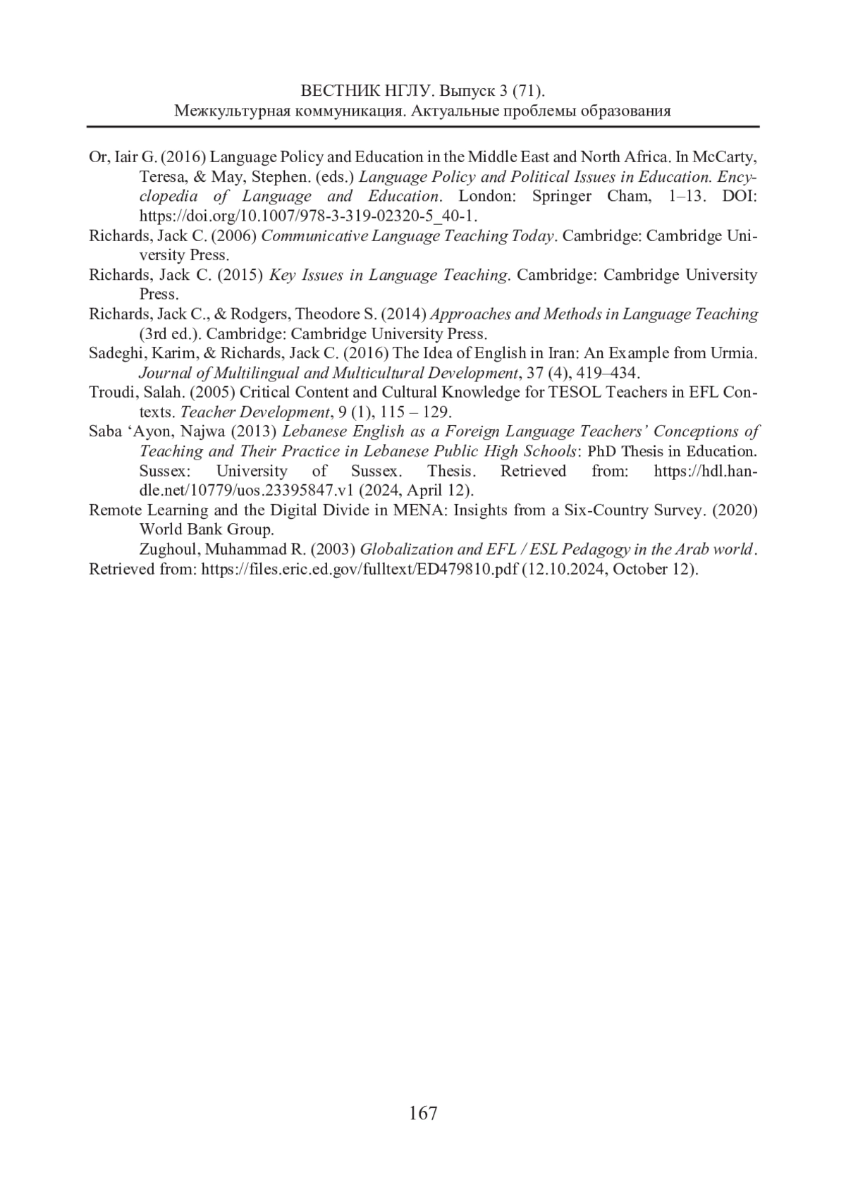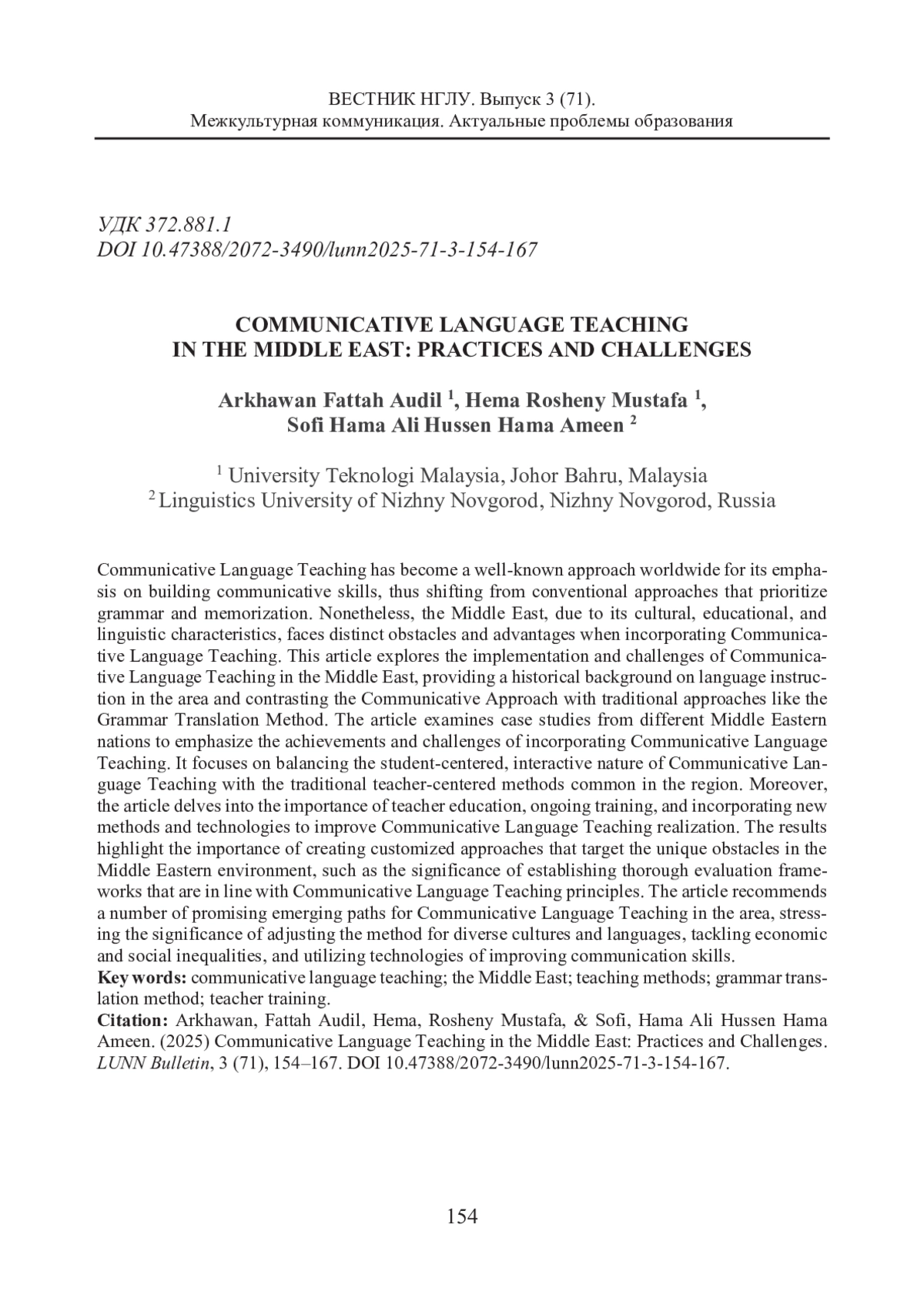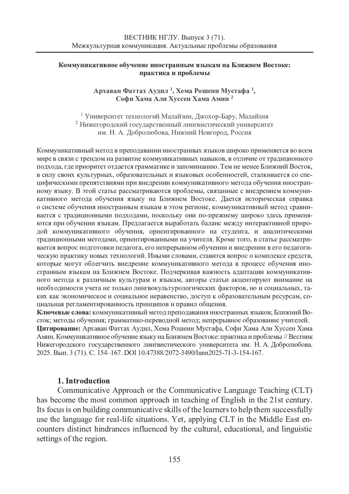 СОФИ Х. А., СОФИ Х. А., АРХАВАН Ф. А., ХЕМА Р. М. КОММУНИКАТИВНОЕ ОБУЧЕНИЕ ИНОСТРАННЫМ ЯЗЫКАМ НА БЛИЖНЕМ ВОСТОКЕ: ПРАКТИКА И ПРОБЛЕМЫ // ВЕСТНИК НИЖЕГОРОДСКОГО ГОСУДАРСТВЕННОГО ЛИНГВИСТИЧЕСКОГО УНИВЕРСИТЕТА ИМ. Н. А. ДОБРОЛЮБОВА. 2025. № 3 (71)