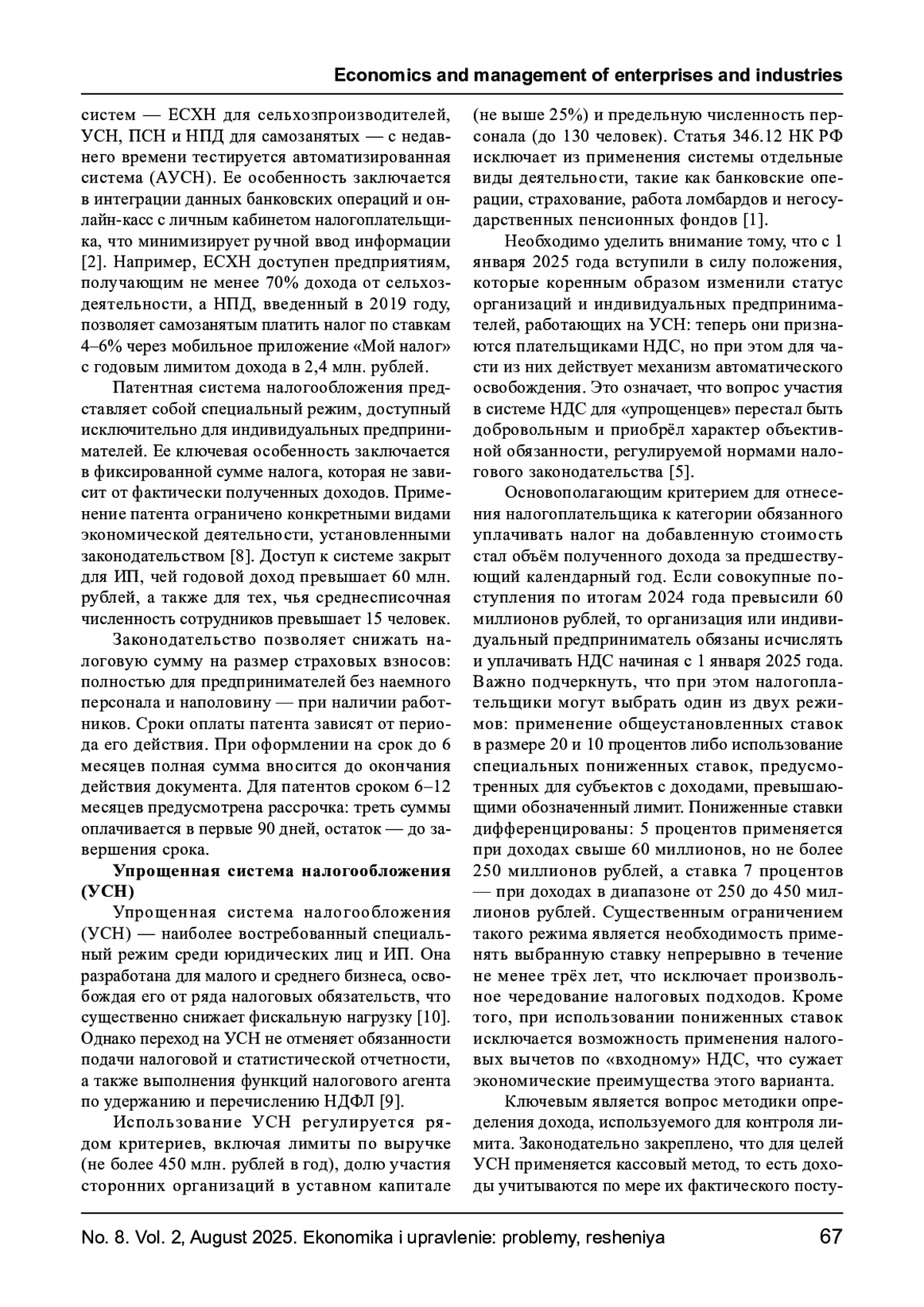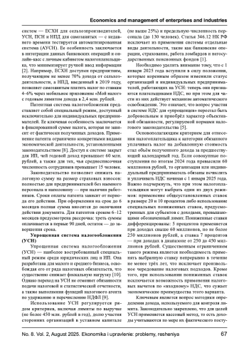 В статье исследуются особенности нормативно- правового регулирования деятельности малого и среднего бизнеса в России, а также трансформация налоговых механизмов, влияющих на функционирование предпринимательского сектора. Рассмотрены ключевые положения федерального законодательства, включая Федеральный закон № 209-ФЗ, а также региональные и муниципальные инициативы, формирующие правовую основу для развития малого предпринимательства. Особое внимание уделено анализу налоговых режимов, доступных субъектам МСП, включая упрощённую систему налогообложения, патентную систему и налог на профессиональный доход. Существенным элементом исследования выступает рассмотрение нововведений 2025 года, связанных с признанием налогоплательщиков на УСН плательщиками НДС. В работе раскрыты критерии применения освобождения, порядок использования пониженных ставок и методологические особенности исчисления налоговой базы. Сделан вывод о том, что модернизация налоговой системы усиливает институциональное значение МСП, формируя новые вызовы для налогового планирования и стратегии финансовой устойчивости. Результаты исследования подчеркивают необходимость поиска оптимального баланса между интересами государства и развитием предпринимательства.