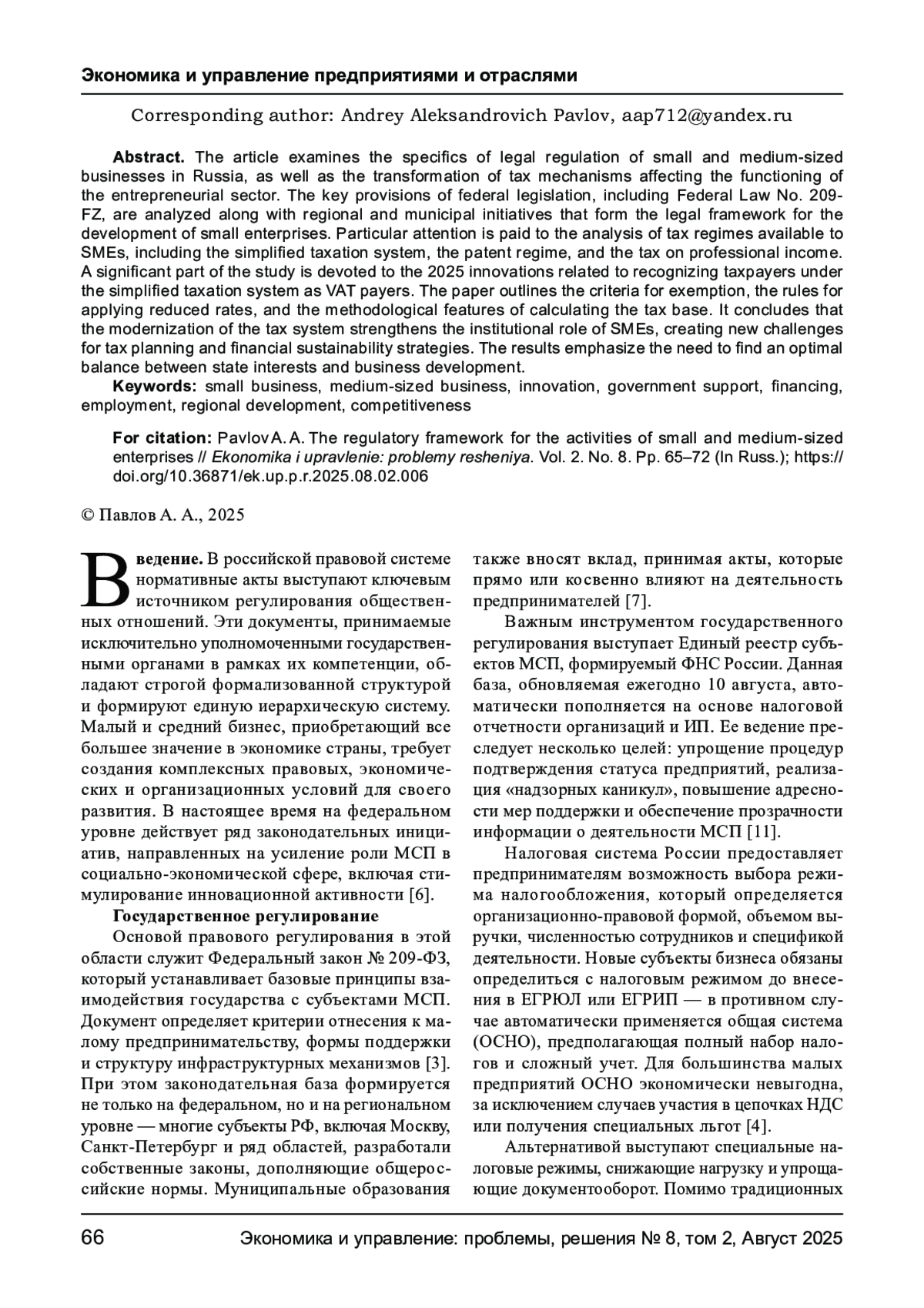 ПАВЛОВ А. А. НОРМАТИВНО-ПРАВОВАЯ БАЗА ДЕЯТЕЛЬНОСТИ МАЛЫХ И СРЕДНИХ ПРЕДПРИЯТИЙ // ЭКОНОМИКА И УПРАВЛЕНИЕ: ПРОБЛЕМЫ, РЕШЕНИЯ. 2025. ТОМ 2 № 8