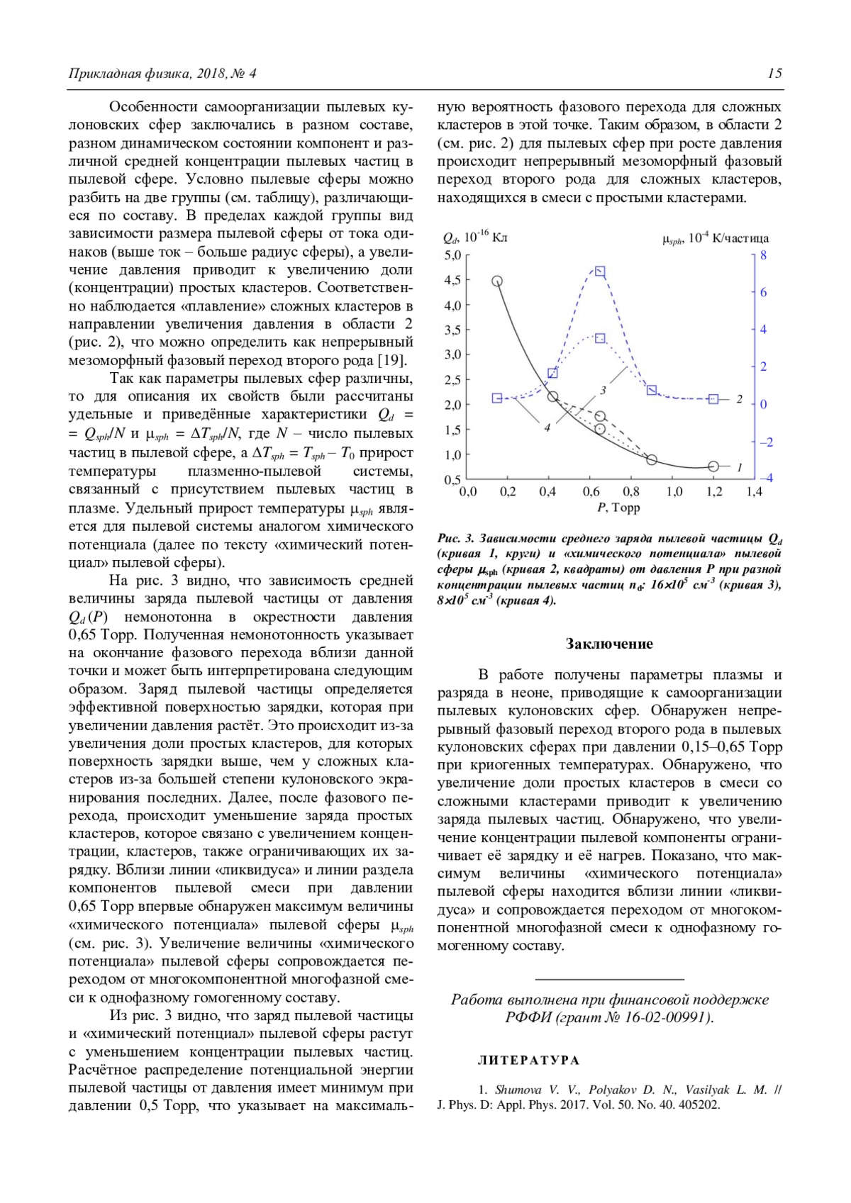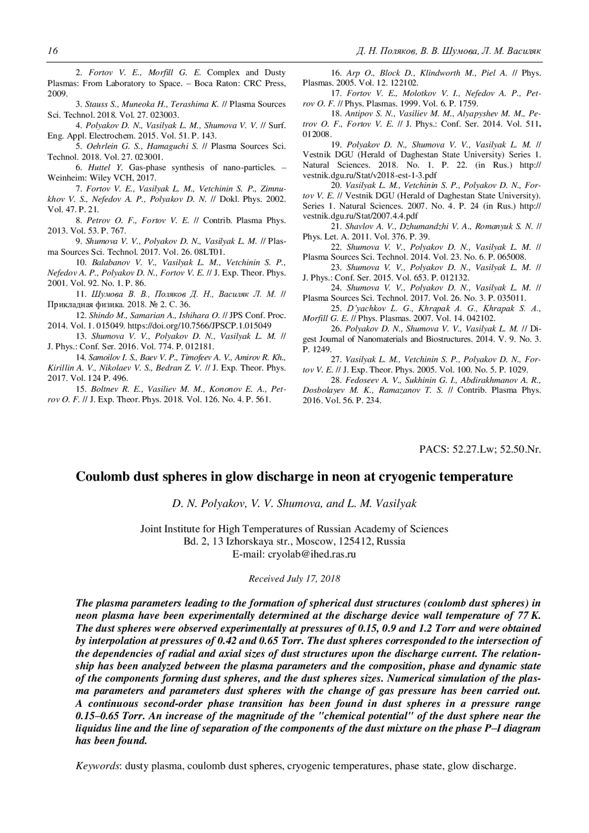 ПОЛЯКОВ Д. Н., ШУМОВА В. В., ВАСИЛЯК Л. М. КУЛОНОВСКИЕ ПЫЛЕВЫЕ СФЕРЫ В ТЛЕЮЩЕМ РАЗРЯДЕ В НЕОНЕ ПРИ КРИОГЕННОЙ ТЕМПЕРАТУРЕ // ПРИКЛАДНАЯ ФИЗИКА. 2018. №4