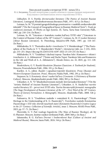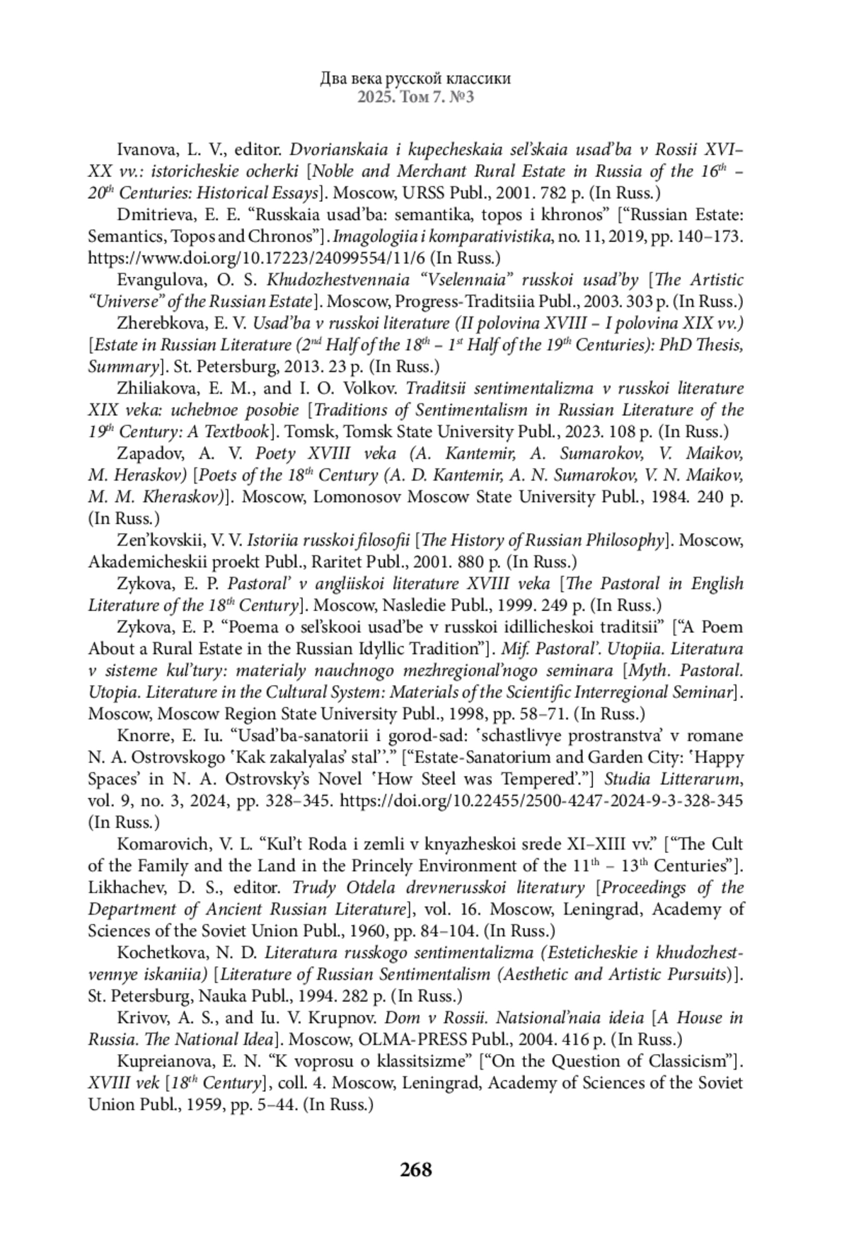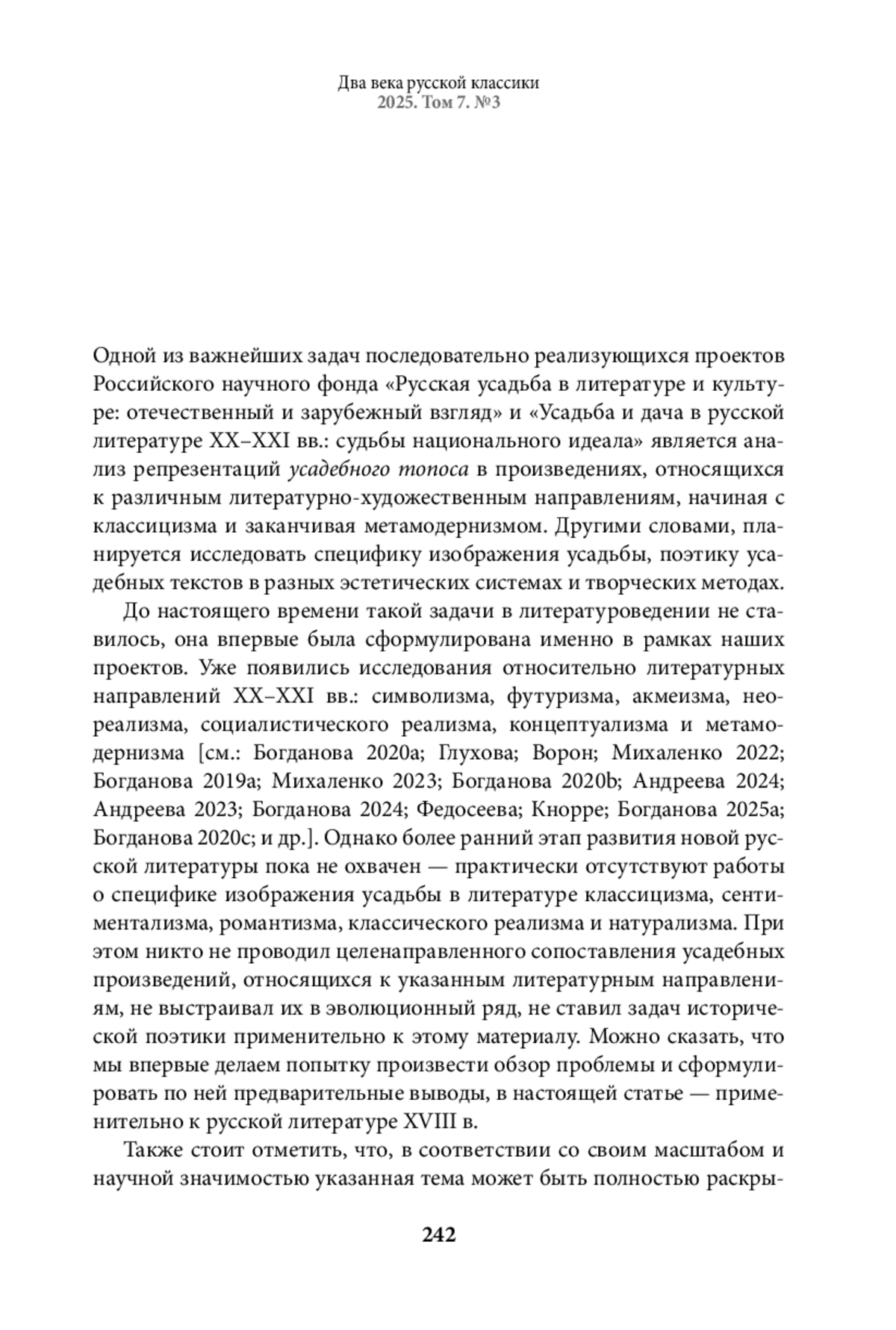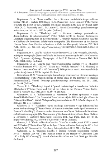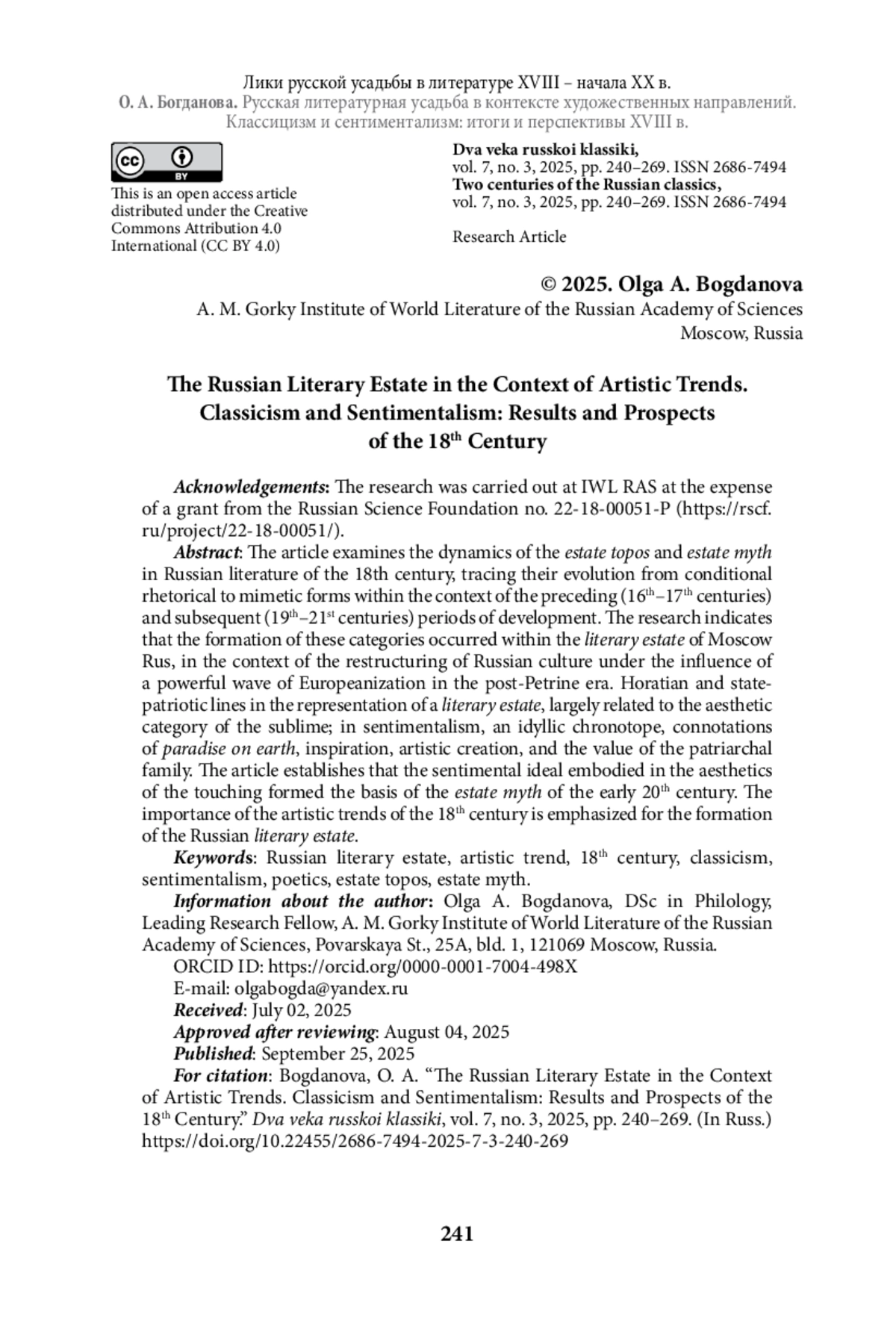 БОГДАНОВА О. А. РУССКАЯ ЛИТЕРАТУРНАЯ УСАДЬБА В КОНТЕКСТЕ ХУДОЖЕСТВЕННЫХ НАПРАВЛЕНИЙ. КЛАССИЦИЗМ И СЕНТИМЕНТАЛИЗМ: ИТОГИ И ПЕРСПЕКТИВЫ XVIII В. // ДВА ВЕКА РУССКОЙ КЛАССИКИ. 2025. № 3, ТОМ 7