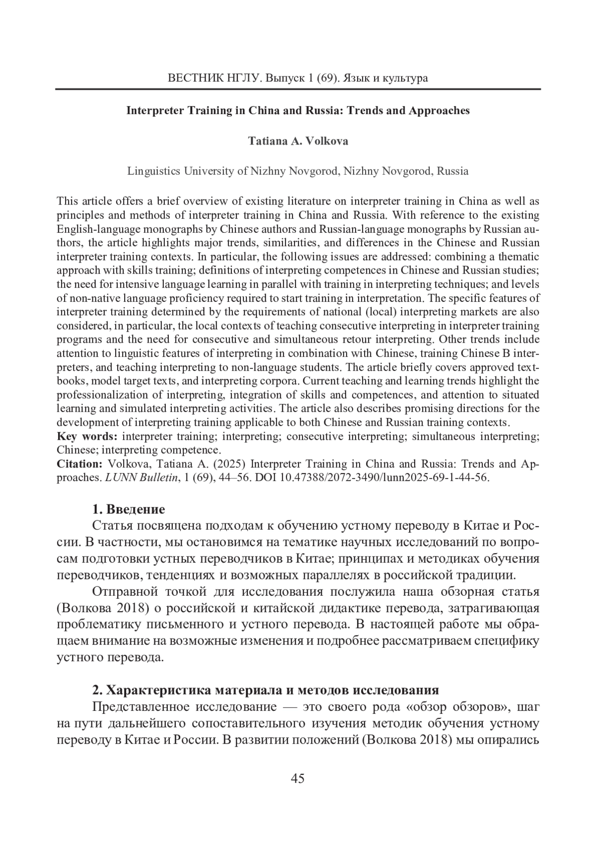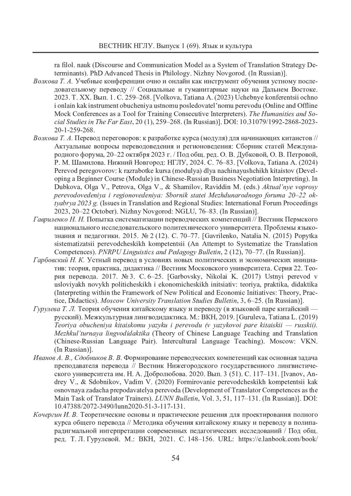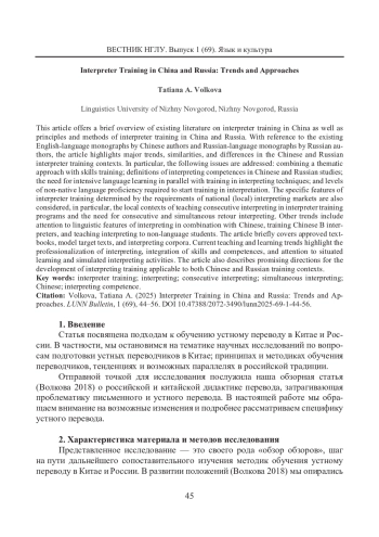 6. Волкова Т. А. Перевод переговоров: к разработке курса (модуля) для начинающих китаистов // Актуальные вопросы переводоведения и регионоведения: Сборник статей Международного форума, 20-22 октября 2023 г. / Под общ. ред. О. В. Дубковой, О. В. Петровой, Р. М. Шамилова. Нижний Новгород: НГЛУ, 2024. С. 76-83. [Volkova, Tatiana A. (2024) Perevod peregovorov: k razrabotke kursa (modulya) dlya nachinayushchikh kitaistov (Developing a Beginner Course (Module) in Chinese-Russian Business Negotiation Interpreting). In Dubkova, Olga V., Petrova, Olga V., & Shamilov, Raviddin M. (eds.) Aktual’nye voprosy perevodovedeniya i regionovedeniya: Sbornik statei Mezhdunarodnogo foruma 20-22 oktyabrya 2023 g. (Issues in Translation and Regional Studies: International Forum Proceedings 2023, 20-22 October). Nizhny Novgorod: NGLU, 76-83. (In Russian)]. EDN: ECMIQV