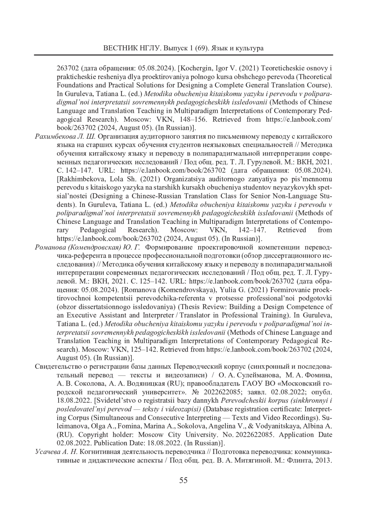 13. Романова (Комендровская) Ю. Г. Формирование проектировочной компетенции переводчика-референта в процессе профессиональной подготовки (обзор диссертационного исследования) // Методика обучения китайскому языку и переводу в полипарадигмальной интерпретации современных педагогических исследований / Под общ. ред. Т. Л. Гурулевой. М.: ВКН, 2021. С. 125-142. URL: https://e.lanbook.com/book/263702 (дата обращения: 05.08.2024). [Romanova (Komendrovskaya), Yulia G. (2021) Formirovanie proektirovochnoi kompetentsii perevodchika-referenta v protsesse professional’noi podgotovki (obzor dissertatsionnogo issledovaniya) (Thesis Review: Building a Design Competence of an Executive Assistant and Interpreter / Translator in Professional Training). In Guruleva, Tatiana L. (ed.) Metodika obucheniya kitaiskomu yazyku i perevodu v poliparadigmal’noi interpretatsii sovremennykh pedagogicheskikh issledovanii (Methods of Chinese Language and Translation Teaching in Multiparadigm Interpretations of Contemporary Pedagogical Research). Moscow: VKN, 125-142. Retrieved from https://e.lanbook.com/book/263702 (2024, August 05). (In Russian)].
