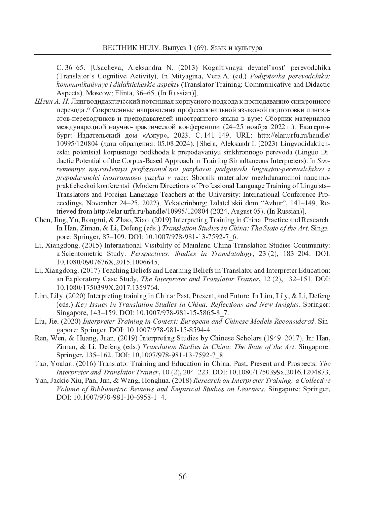 2. Ван Ш. Особенности учебных пособий по обучению устному переводу для китайских студентов-филологов // Преподаватель ХХI век. 2016. № 1. С. 178-184. [Wang, Shuang. (2016) Osobennosti uchebnykh posobii po obucheniyu ustnomu perevodu dlya kitaiskikh studentov-filologov (Features of Educational Manuals for Oral Interpreting Training for Chinese Language Students). Prepodavatel XXI vek, 1, 178-184. (In Russian)].