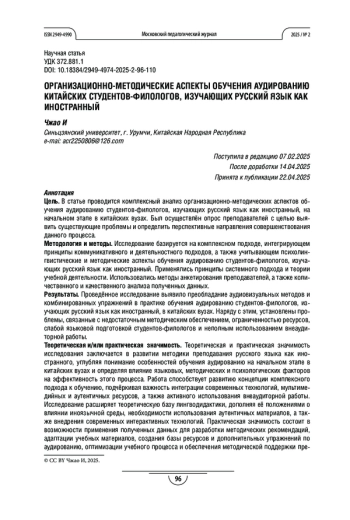Методология и методы. Исследование базируется на комплексном подходе, интегрирующем принципы коммуникативного и деятельностного подходов, а также учитывающем психолингвистические и методические аспекты обучения аудированию студентов-филологов, изучающих русский язык как иностранный. Применялись принципы системного подхода и теории учебной деятельности. Использовались методы анкетирования преподавателей, а также количественного и качественного анализа полученных данных.