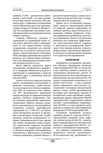 Выводы. Результаты подчёркивают необходимость создания библиотеки ресурсов и дополнительных упражнений по аудированию, внедрения современных технологий и повышения квалификации преподавателей для эффективного обучения аудированию студентов-филологов, изучающих русский язык как иностранный. Для решения выявленных проблем необходим комплексный подход, сочетающий современные методики и аутентичные материалы.