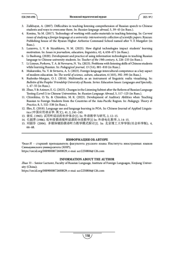 3. Зульхаят А. Трудности обучения аудированию русской речи китайских студентов и пути их преодоления // Русский язык за рубежом. 2007. № 5. С. 39-43. EDN: IJOFHV