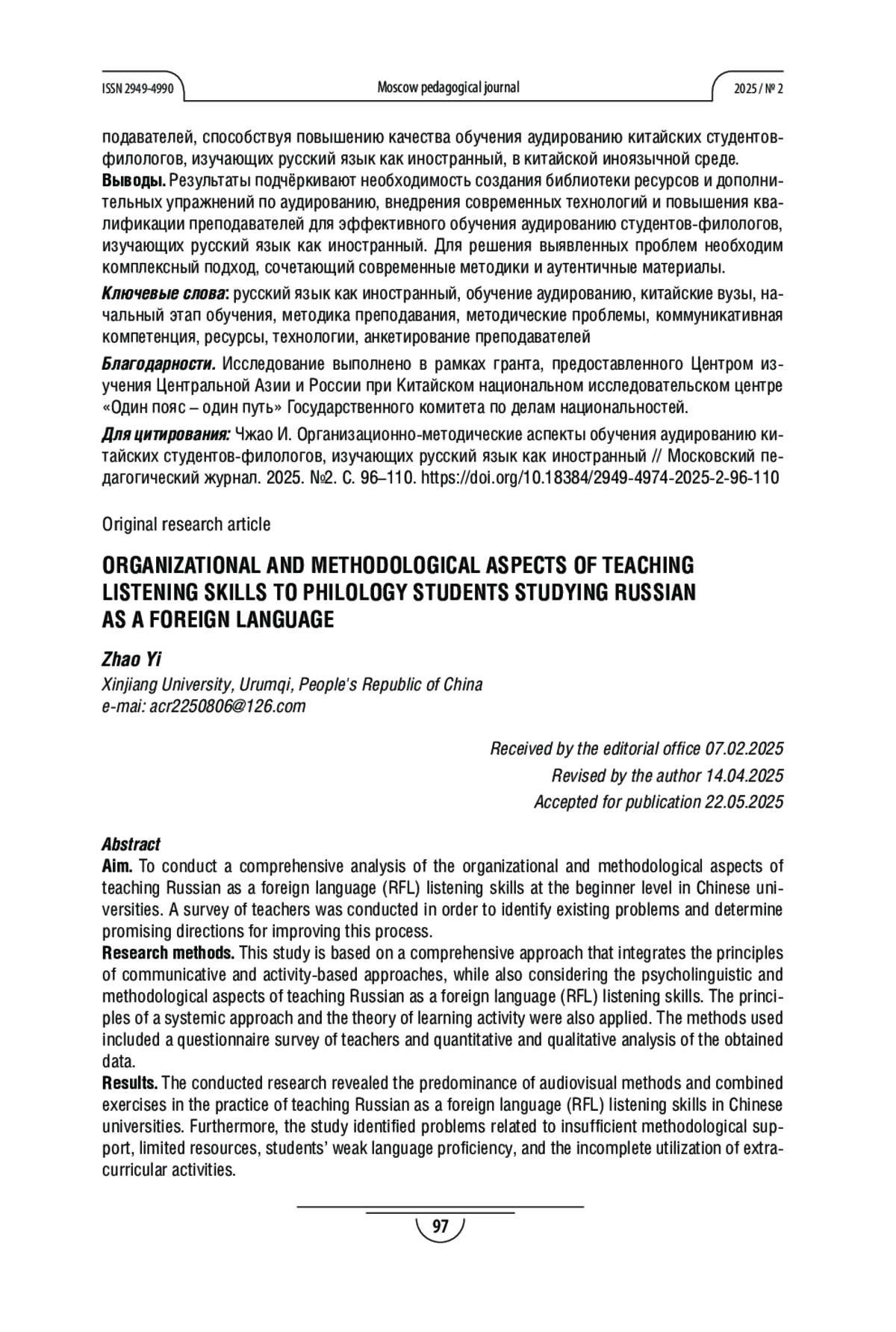 10. Чжао И, Азимов Э. Г. Изменения субтеста “аудирование” после реформы тестирования по русскому языку (I уровень) в китайских вузах // Русский язык за рубежом. 2023. № 5. С. 117-125. EDN: RIAUXC