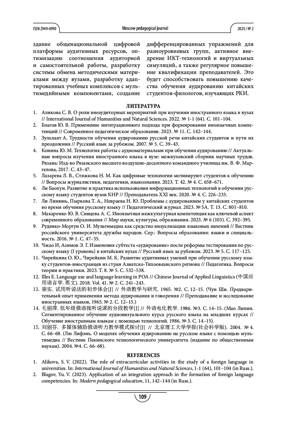 7. Ли Линюнь, Пыркова Т. А., Невраева Н. Ю. Проблемы с аудированием у китайских студентов во время обучения русскому языку // Педагогический журнал. 2023. № 5А. Т. 13. С. 801-810.