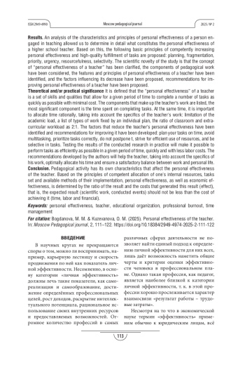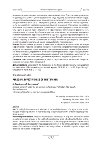 Теоретическая и/или практическая значимость. Дано определение, что «личная эффективность» преподавателя - это совокупность навыков и качеств, которые позволяют за заданный промежуток времени выполнить ряд задач максимально быстро с минимальными затратами. Перечислены компоненты, из которых складывается труд педагога: наиболее существенным компонентом является время, потраченное на выполнение задач. При этом важно рационально распределять время, с учётом особенностей труда педагога: ограничение учебной нагрузки, закреплённый индивидуальным планом перечень видов работ, соотношение аудиторной и внеаудиторной нагрузки как 2:1. Определены факторы, которые снижают личную эффективность преподавателя, и разработаны рекомендации её повышения: планировать свои задачи по времени, уход от многозадачности, правильно расставлять приоритеты задач, не откладывать задачи в «долгий ящик», стремиться к эффективному использованию ресурсов, быть избирательным в задачах. Апробация результатов проведённого исследования на практике позволит максимально эффективно выполнять задачи за заданный промежуток времени быстро по времени и с меньшими трудовыми затратами. Разработанные авторами рекомендации помогут педагогу, с учётом особенностей его труда, оптимально распределять своё время, обеспечить удовлетворительный баланс между работой и личной жизнью.
