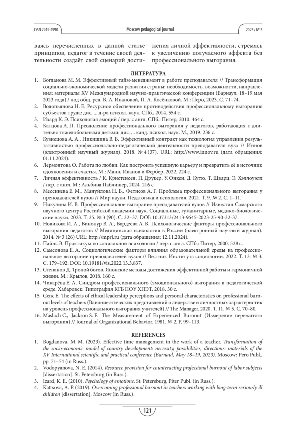 8. Мессинева Е. М., Мануйлова Н. Б., Фетисов А. Г. Проблема профессионального выгорания у преподавателей вузов // Мир науки. Педагогика и психология. 2021. Т. 9. № 2. С. 1-11. EDN: WTWTIF