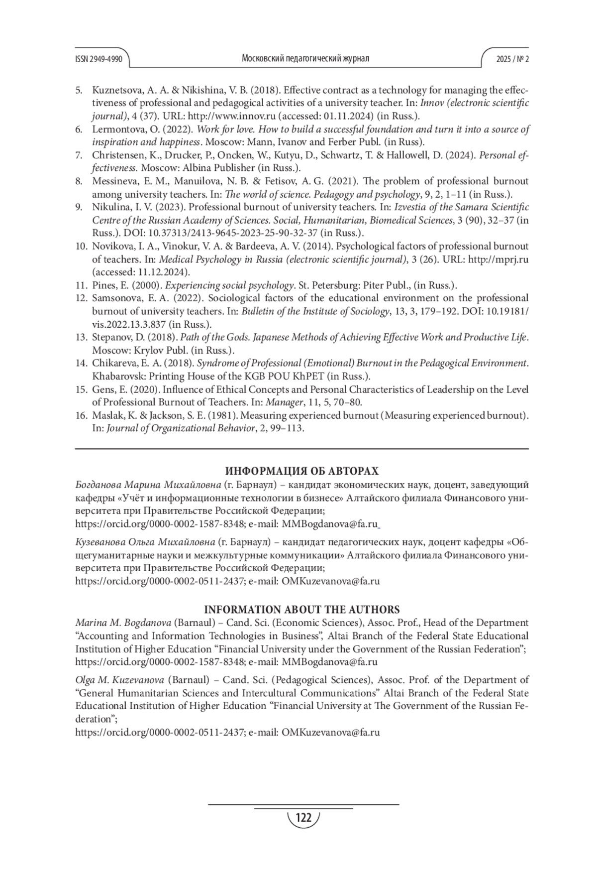 9. Никулина И. В. Профессиональное выгорание преподавателей вузов // Известия Самарского научного центра Российской академии наук. Социальные, гуманитарные, медико-биологические науки. 2023. Т. 25. № 3 (90). С. 32-37. DOI: 10.37313/2413-9645-2023-25-90-32-37 EDN: SNJTAA