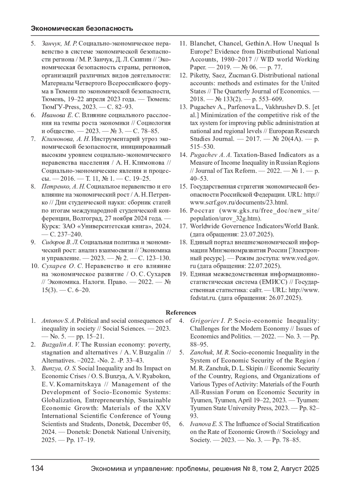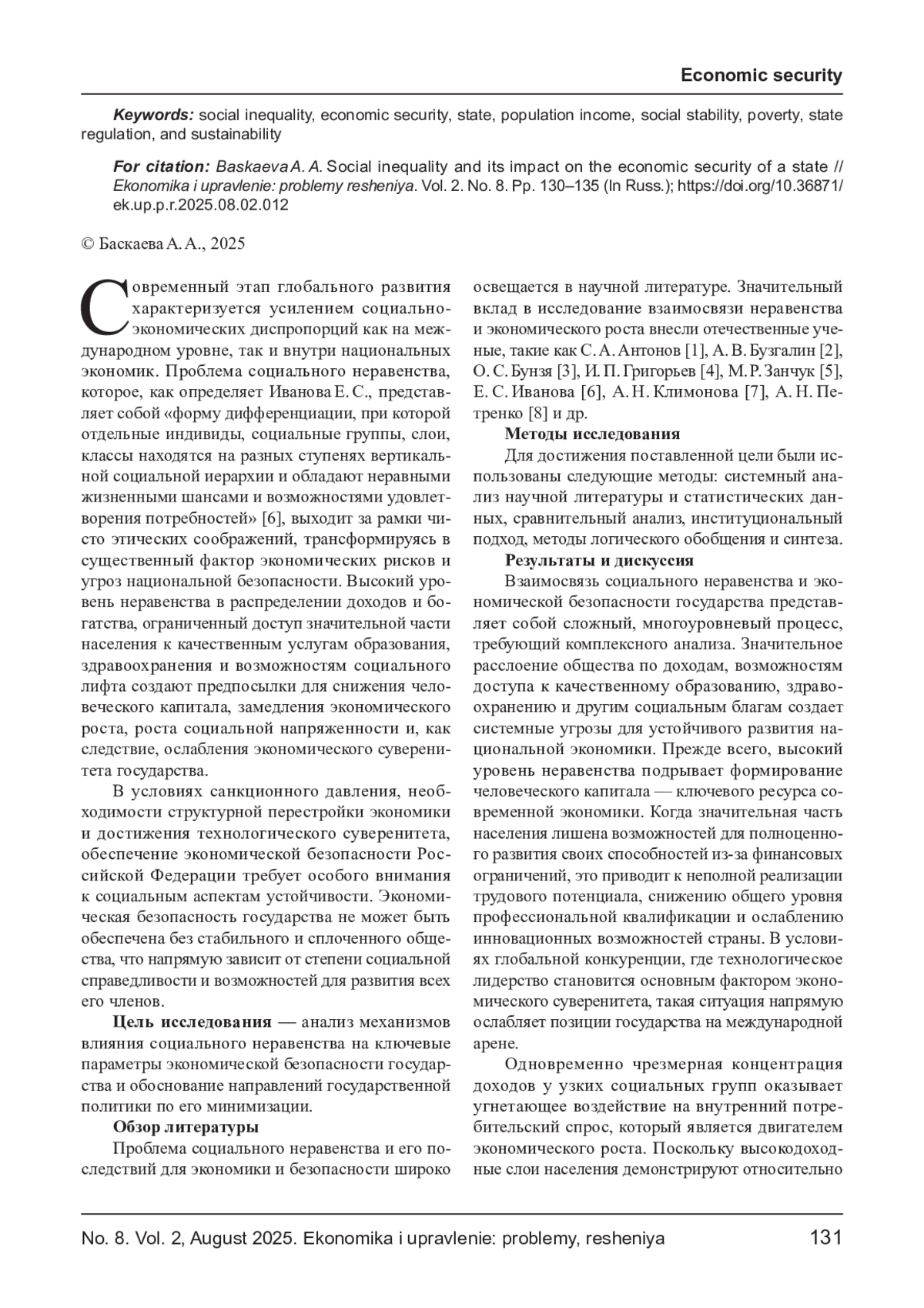 БАСКАЕВА А. А. СОЦИАЛЬНОЕ НЕРАВЕНСТВО И ЕГО ВЛИЯНИЕ НА ЭКОНОМИЧЕСКУЮ БЕЗОПАСНОСТЬ ГОСУДАРСТВА // ЭКОНОМИКА И УПРАВЛЕНИЕ: ПРОБЛЕМЫ, РЕШЕНИЯ. 2025. ТОМ 2 № 8