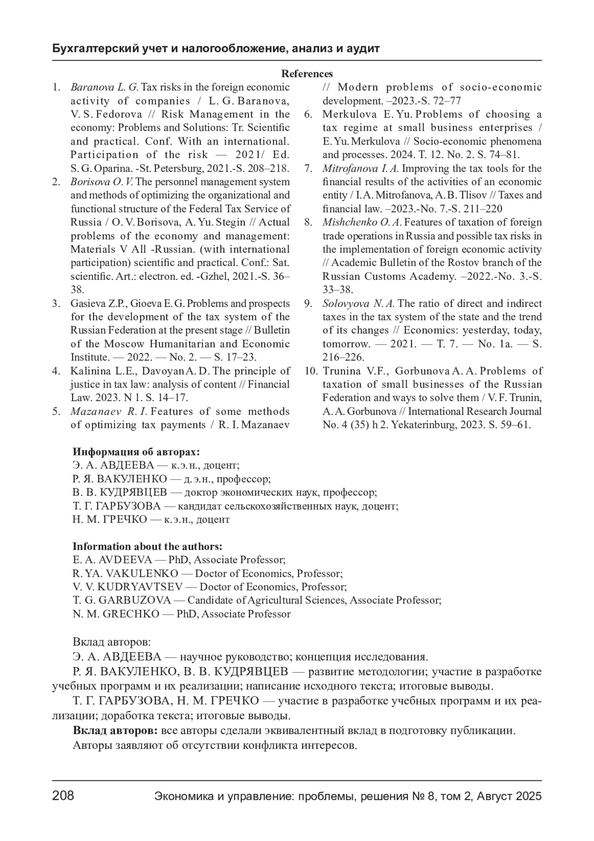 1. Баранова Л. Г. Налоговые риски во внешнеэкономической деятельности компаний / Л. Г. Баранова, В. С. Федорова // Управление рисками в экономике: проблемы и решения: тр. науч.-практ. конф. с междунар. участием РИСК’Э - 2021/ под ред. С. Г. Опарина. - Санкт- Петербург, 2021. - С. 208-218.