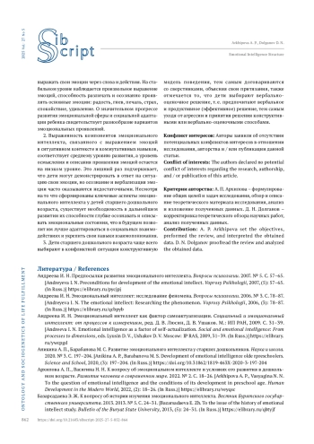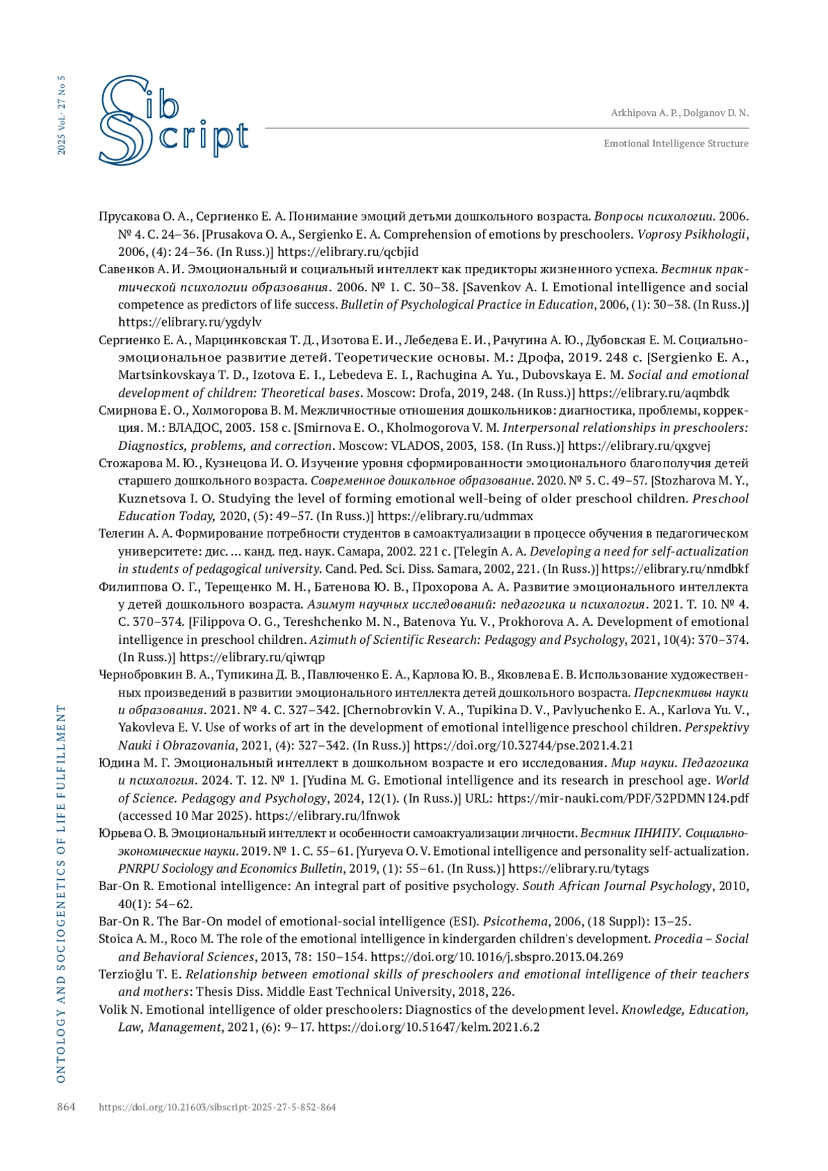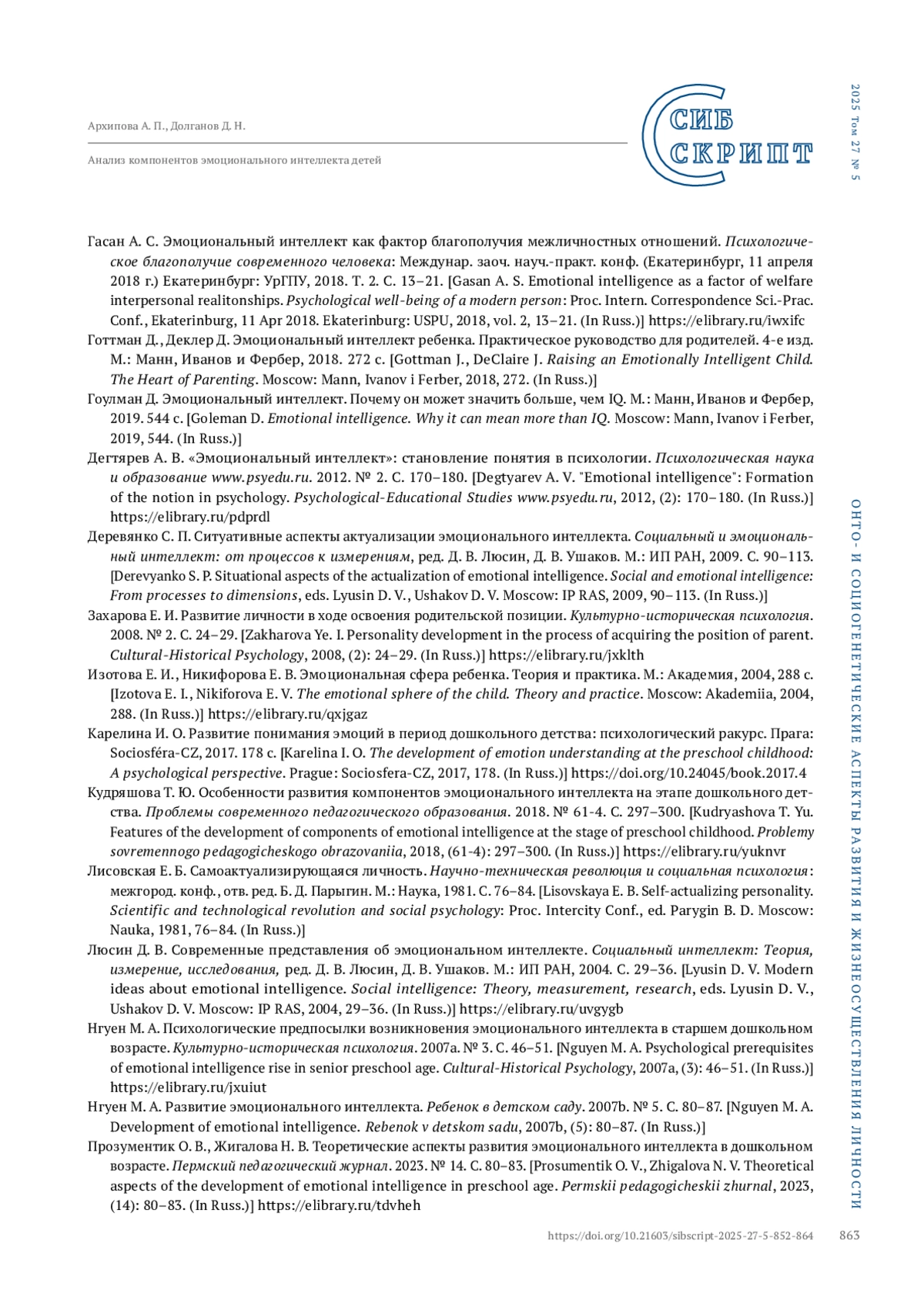 5. Архипова А. П., Васягина Н. Н. К вопросу об эмоциональном интеллекте и условиях его развития в дошкольном возрасте. Развитие человека в современном мире. 2022. № 2. С. 18-26. https://elibrary.ru/veyqsc