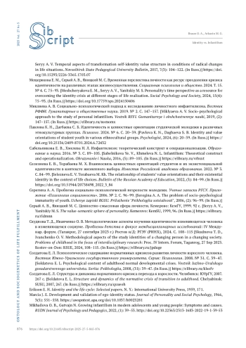 21. Скуднова Т. Д., Иванченко О. В. Методологические аспекты изучения идентичности изменяющегося человека в изменяющемся социуме. Проблемы детства в фокусе междисциплинарных исследований: IV Междунар. форум. (Таганрог, 27 сентября 2023 г.) Ростов н/Д: РГЭУ (РИНХ), 2024. С. 108-115 https://elibrary.ru/jpduge