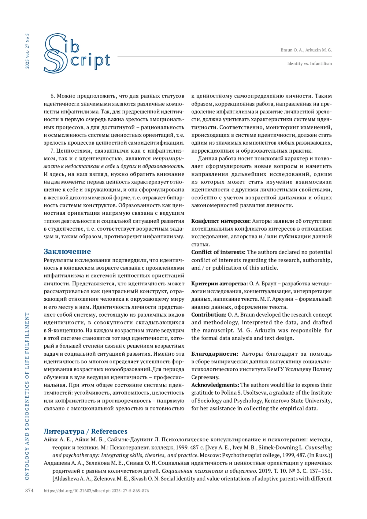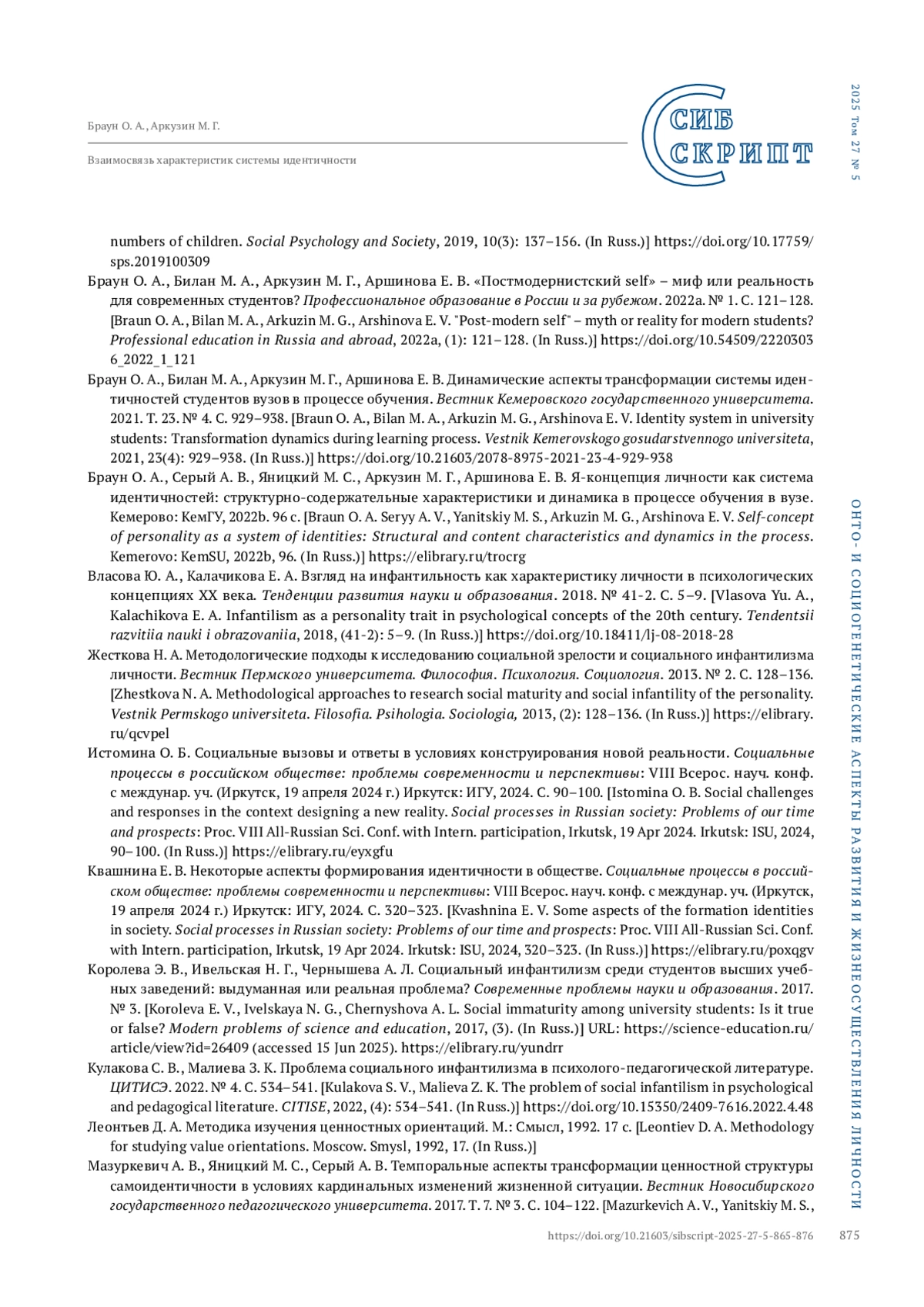 5. Браун О. А., Серый А. В., Яницкий М. С., Аркузин М. Г., Аршинова Е. В. Я-концепция личности как система идентичностей: структурно-содержательные характеристики и динамика в процессе обучения в вузе. Кемерово: КемГУ, 2022b. 96 с. https://elibrary.ru/trocrg