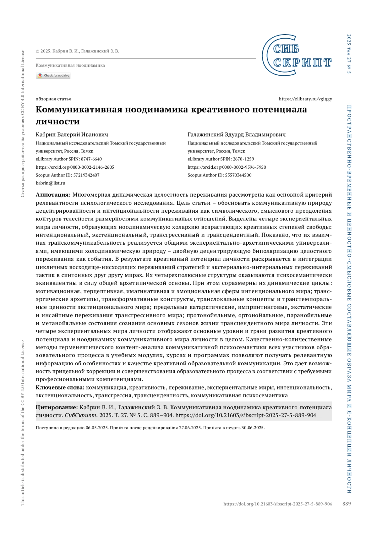 22. Кабрин В. И., Галажинский Э. В. Коммуникативная психосемантика индивидуального образовательного мира личности. Сибирский психологический журнал. 2023. № 89. С. 28-43. https://elibrary.ru/jnbbvi