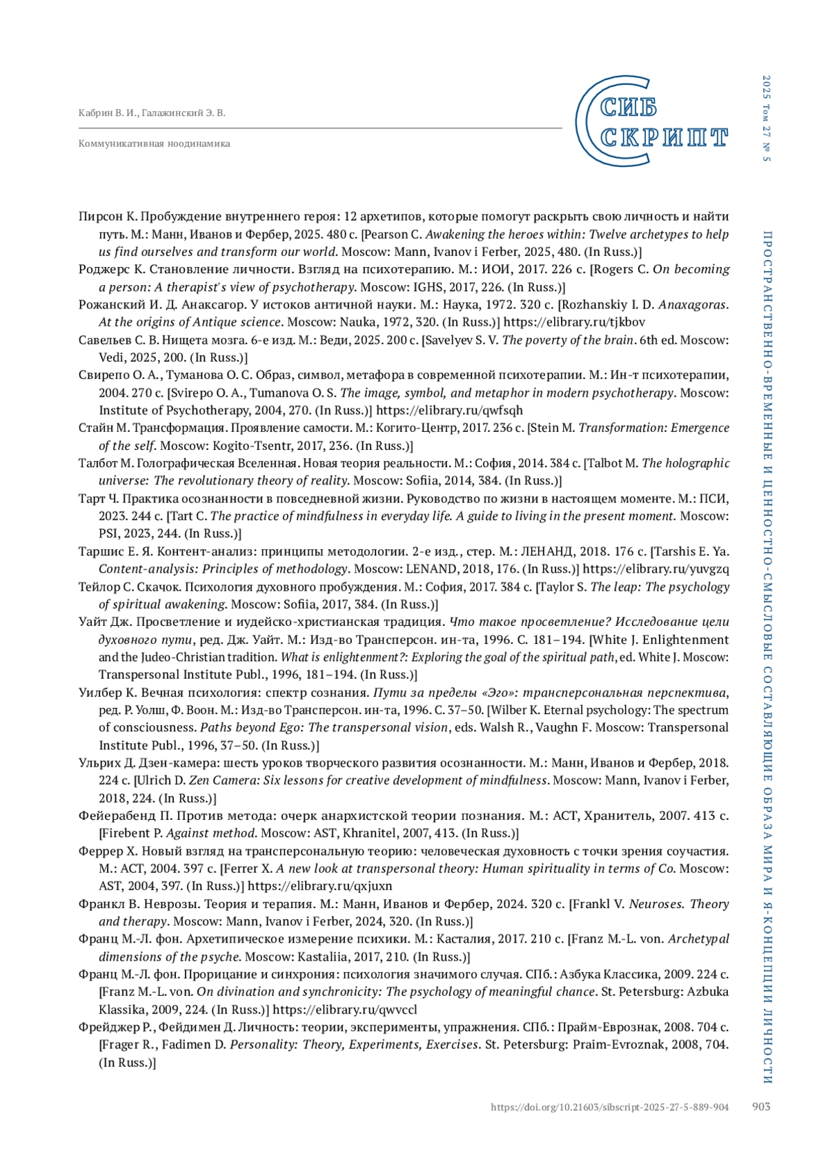 18. Кабрин В. И. Коммуникативная психосемантика когнитивно-ноэтического развития личности. Сибирский психологический журнал. 2022. № 85. С. 51-71. https://doi.org/10.17223/17267080/85/3