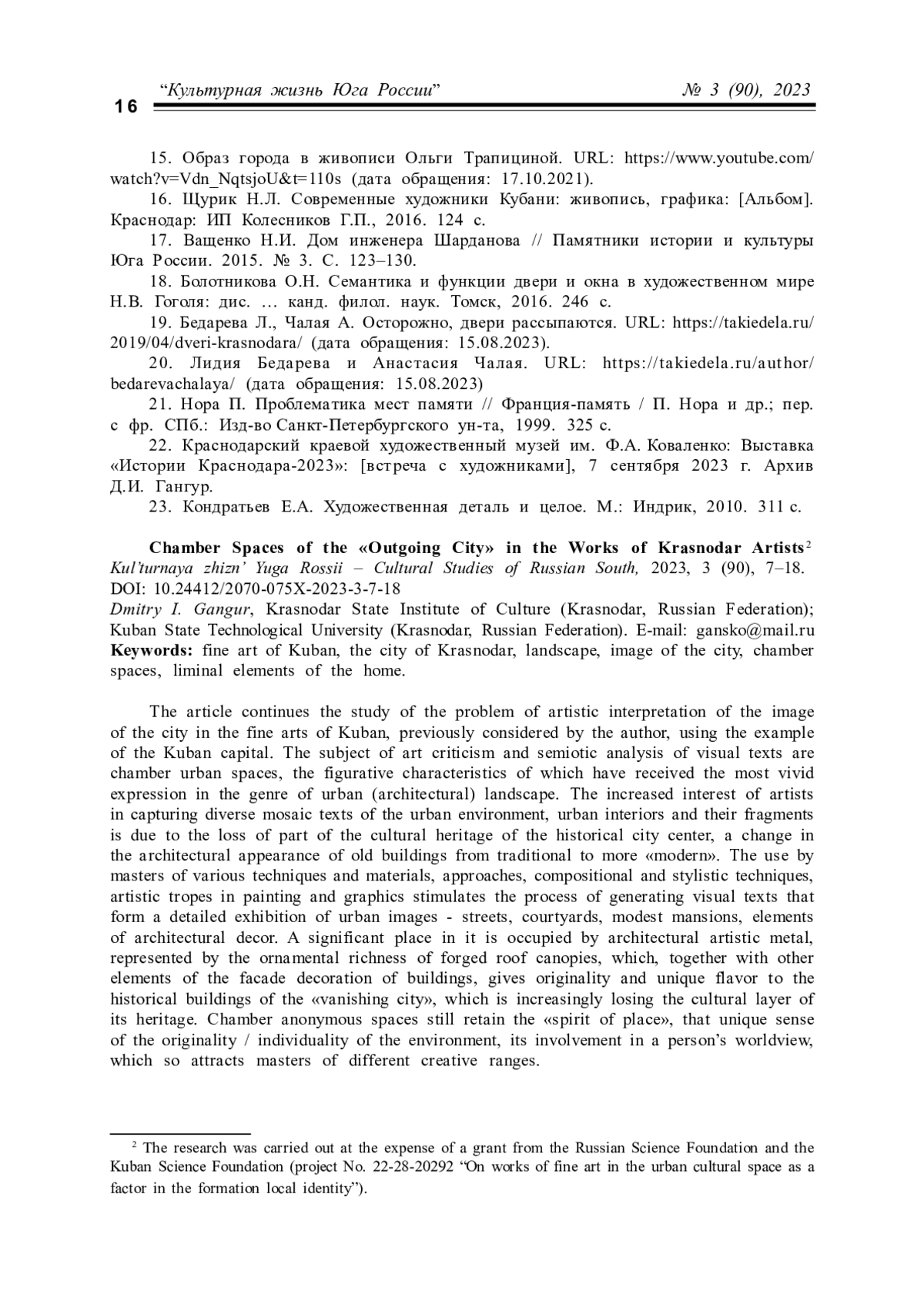 2. Гангур Д.И. Город и его символы в изобразительном искусстве Кубани (на материале города Краснодара) // Культурная жизнь Юга России. 2022. № 4. С. 59-72. EDN: CDCQAX