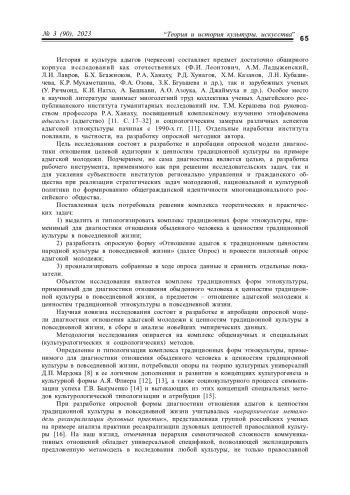 Предмет исследования – отношение адыгской молодежи к ценностям традиционной этнокультуры в повседневной жизни. Научная новизна обусловлена комплексом общенаучных и специальных методов, включая культурол огическую атрибуцию и контент-анализ, который позволил рассмотреть предмет исследования как ресурс формирования общероссийской гражданской ид ентичности. Полученные результаты свидетельствуют, что традиционные ценности населяющих Россию народов являются важным фактором и социокультурным основанием развития общероссийской гражданской идентичности