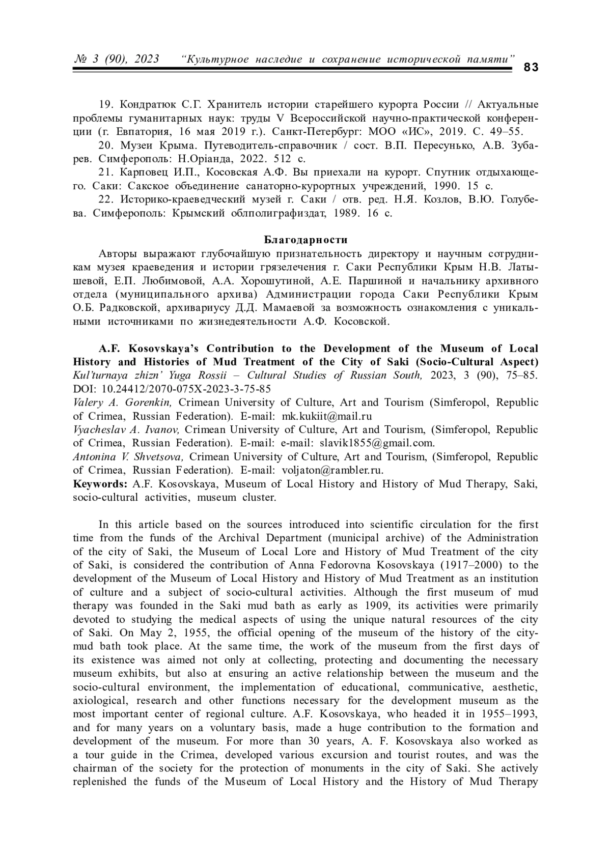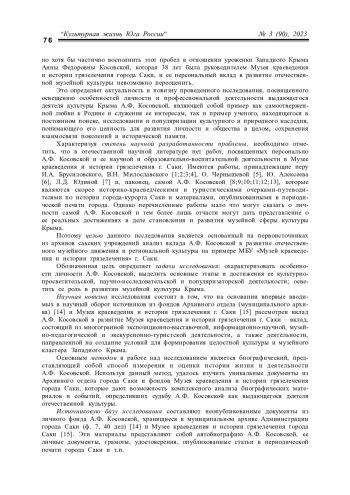 В статье, на основании впервые вводимых в научный оборот источников из фондов Архивного отдела (муниципального архива) Администрации города Саки, Музея краеведения и истории грязелечения города Саки, рассматривается вклад Анны Федоровны Косовской (1917–2000) в развитие МБУ «Музей краеведения и истории грязелечения» г. Саки как института культуры и субъекта социокультурной деятельности. Огромный вклад в становление и развитие музея внесла А. Ф. Косовская, возглавлявшая его в 1955–1993 гг., и долгие годы – на общественных началах. Более 30 лет А. Ф. Косовская также работала экскурсоводом по Крыму, разрабатывала различные экскурсионно-туристические маршруты, являлась председателем общества по охране памятников г. Саки. Она активно пополняла фонды Музея краеведения и истории грязелечения уникальными экспонатами, принимала участие в экспозиционно-выставочной работе и популяризации краеведческих и культуроведческих знаний. В статье акцентируется внимание на усилиях А. Ф. Косовской по превращению Западного Крыма (Евпатория, Саки, пгт. Черноморское) в единое культурное пространство, музейный кластер, с целью создания развитой системы взаимодействий и коммуникаций между различными субъектами культуры ради эффективного сотрудничества в деле культурного, экономического и социального развития полуострова