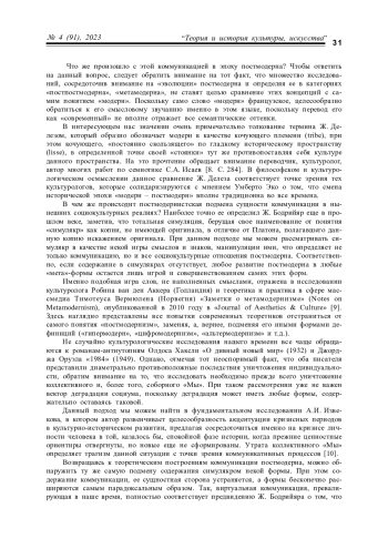В данной статье авторы рассматривают эволюцию коммуникации и, в первую очередь, ее культурологические аспекты в ситуации постмодерна. Проблематика и актуальность данной статьи видится авторам прежде всего в том, что классические модели культурологического, семиотического и философского осмысления феномена коммуникации подвергаются детеоретизации в парадигме постмодернизма. Обращение к эволюции самого понятия коммуникации, культурологический подход к данному процессу, представляет научную новизну, поскольку позволяет расширить возможные направления исследований в данной сфере на поле отечественного культурологического знания. Исследование построено на методе сравнительного анализа, что позволяет читателю аргументированно сопоставить классические теории коммуникации с широкой палитрой навязываемых социуму постмодернистских концепций, в которых сама человеческая коммуникативная бытность выступает в качестве симулякра