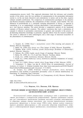 Аксиологический аспект ретрансляции культурного кода в креативных индустриях рассмотрен в исторической ретроспективе. Трактуя креативные индустрии как естественное продолжение развития массовой культуры индустриального общества, авторы статьи отмечают, что, получив первоначальное институциональное оформление в Англии конца 1990-х годов, данная модель социокультурного развития сфокусировала в себе ценности общества потребления, которые в глобализированной форме продвигались коллективным Западом в мировом сообществе. При таком подходе ретрансляция культурного кода предстает не более, чем игровая стилизация, являющаяся инструментом продвижения региональной идентичности, формально имеющей признаки этнографической атрибутики, вуалирующей глубинные характеристики ценностей коллективного Запада. В условиях построения многополярно мира, когда признается суверенитет и значимость национальных государств, ретрансляция культурного кода в креативных индустриях основывается на традиционных культурных ценностях, что подтверждает китайский и российский опыт построения и развития креативных индустрий, охарактеризованный авторами статьи