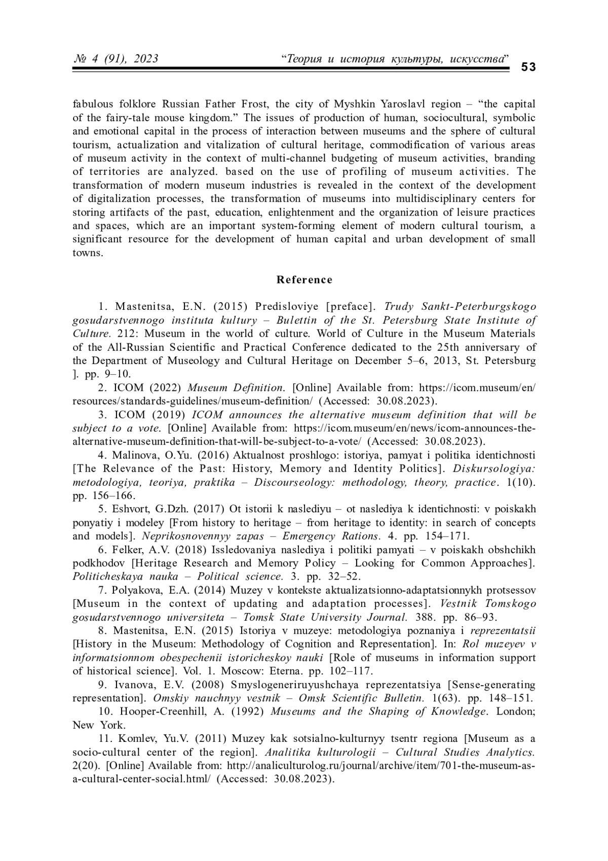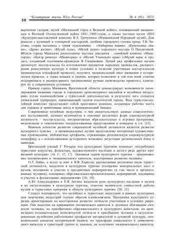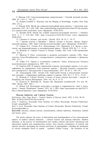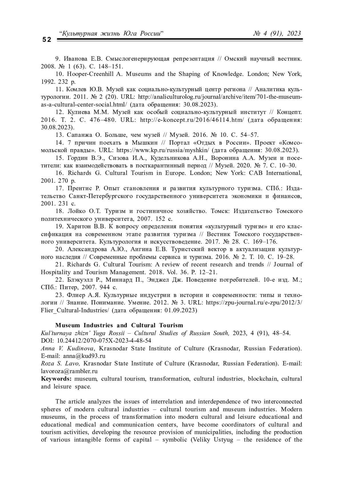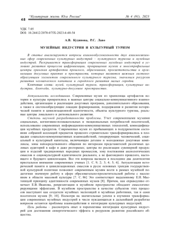 КУДИНОВА А. В., ЛАВО Р. С. МУЗЕЙНЫЕ ИНДУСТРИИ И КУЛЬТУРНЫЙ ТУРИЗМ // КУЛЬТУРНАЯ ЖИЗНЬ ЮГА РОССИИ. 2023. № 4 (91)