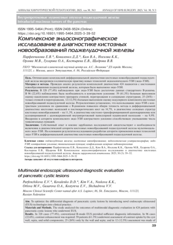 В последние годы наблюдается значительное увеличение распространенности кистозных новообразований (КН) поджелудочной железы (ПЖ), что обусловлено повышением осведомленности об их существовании, совершенствованием лучевых методов диагностики, а также старением населения. Частота выявления КНПЖ при аутопсиях достигает 24,3%.