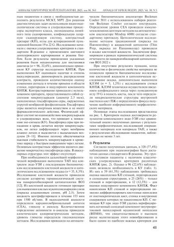Результаты. В 328 (77,4%) наблюдениях при эндо-УЗИ было достаточно данных стандартного В-режима. В 96 (22,6%) наблюдениях была необходимость в контрастном усилении: 59 (61,5%) больным выполнили оценку накопления контрастного препарата стенкой, перегородками и солидными структурами, 25 (26%) – только стенкой и перегородками, 12 (12,5%) больным выполнили оценку нодулярного компонента кистозных новообразований поджелудочной железы. Ретроспективно установлено, что использование эндо-УЗИ с контрастным усилением по сравнению с В-режимом повысило общую точность метода в дифференциальной диагностике кистозных неоплазий и постнекротических кист на 14,7%, в диагностике солидных структур кистозных новообразований – на 11,3%, в диагностике кистозно-трансформированной аденокарциномы или ассоциированной с аденокарциномой внутрипротоковой папиллярной муцинозной неоплазии – на 9,9%. Внедрение в алгоритм комплексного эндо-УЗИ контрастного усиления способствовало уменьшению числа тонкоигольных пункций.