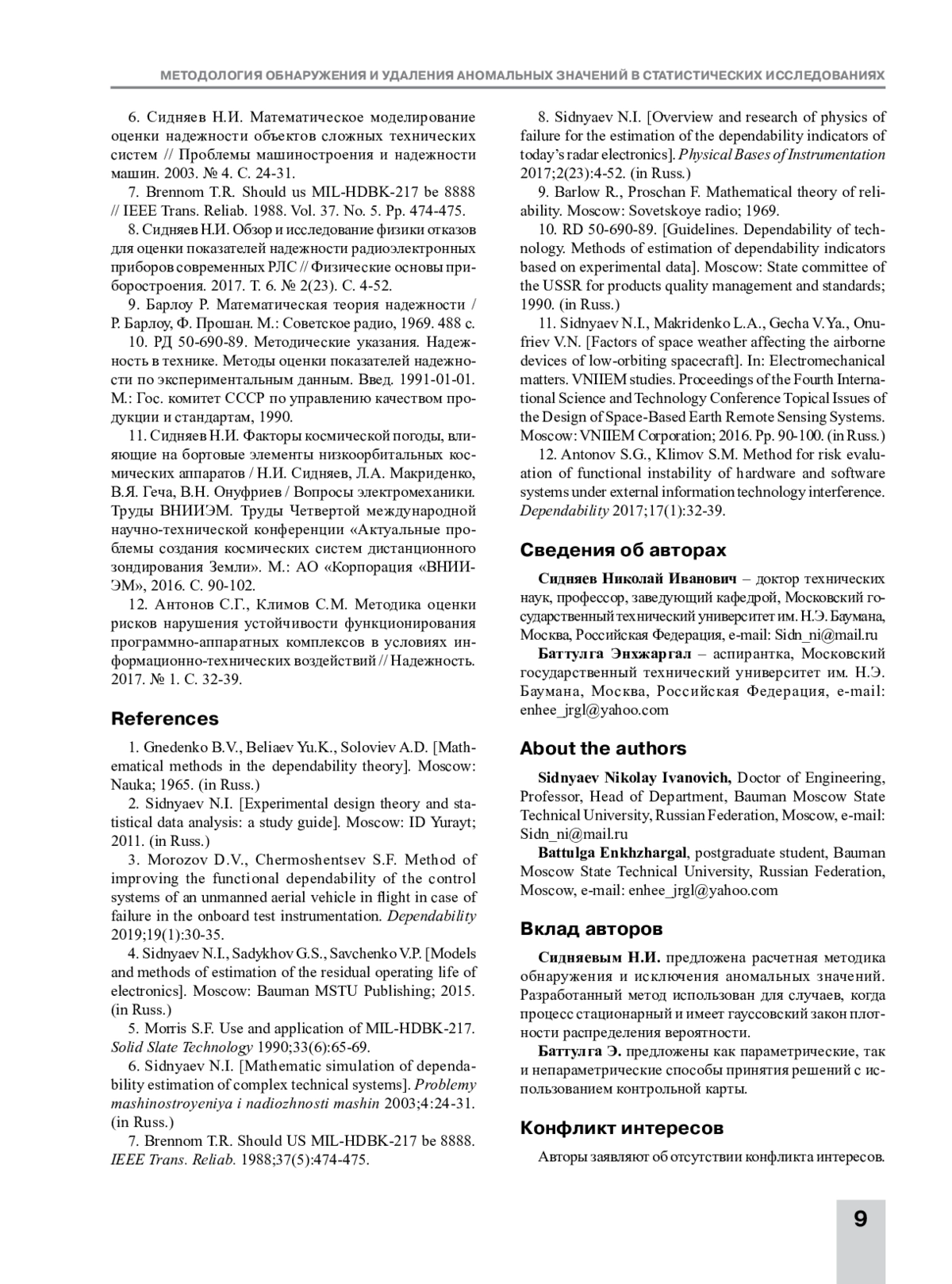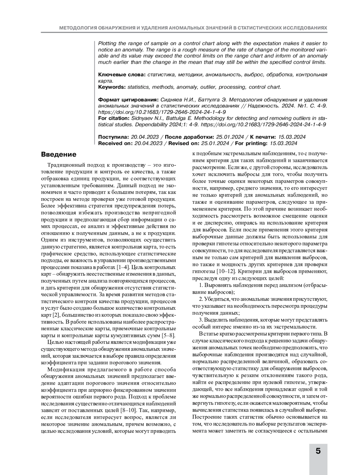 В статье приведена расчетная методика обнаружения и исключения аномальных значений. Показано, что ее эффективность зависит от объема априорной информации об исследуемом процессе. Предложенный метод использован для случаев, когда процесс стационарный и имеет гауссовский закон плотности распределения вероятности. При анализе нестационарных случайных процессов существующие методы и алгоритмы опираются на то, что аномальная составляющая является аддитивной и априорно известны характеристики аномальных значений. В работе использовалась теория статистических решений, которая позволяет формализовать алгоритмы проверок и выбрать критерий обнаружения аномальных значений. Предложены как параметрические, так и непараметрические методы. В первом случае необходимо располагать априорными сведениями как о функции полезной составляющей, так и о законе распределения аномальной составляющей процесса, а также и о его параметрах. Постулируется, что использование непараметрических методов обработки требует значительно меньше априорной информации, но их эффективность определяется параметрами обработки, которые, в свою очередь, зависят от функции полезной и закона распределения аномальной составляющих процесса. Отмечено, что выброс может в действительности оказаться одним из экстремальных значений распределения вероятности случайной величины. Изложены проблемы неопределенности информации по входным данным при расчетах классическими методами. Исследован характер влияния внешних факторов на надежность и степень учета факторов в существующих методах. Представлены методики оценки ресурса исследуемых объектов, среди которых важное место занимают методики, основанные на использовании контрольных карт. Показано, что размах оказывается более удобной для подсчета мерой рассеяния данных, чем стандартное отклонение. Нанесение на контрольную карту наряду с математическим ожиданием размаха выборки позволяет легче заметить аномальное изменение. Размах служит грубой мерой скорости изменения переменной, за которой ведется наблюдение, и его значение может выйти за контрольные пределы на карте размаха и подать сигнал аномалии значительно раньше, чем изменение среднего, которое при этом еще может находиться в заданных контрольных пределах.
